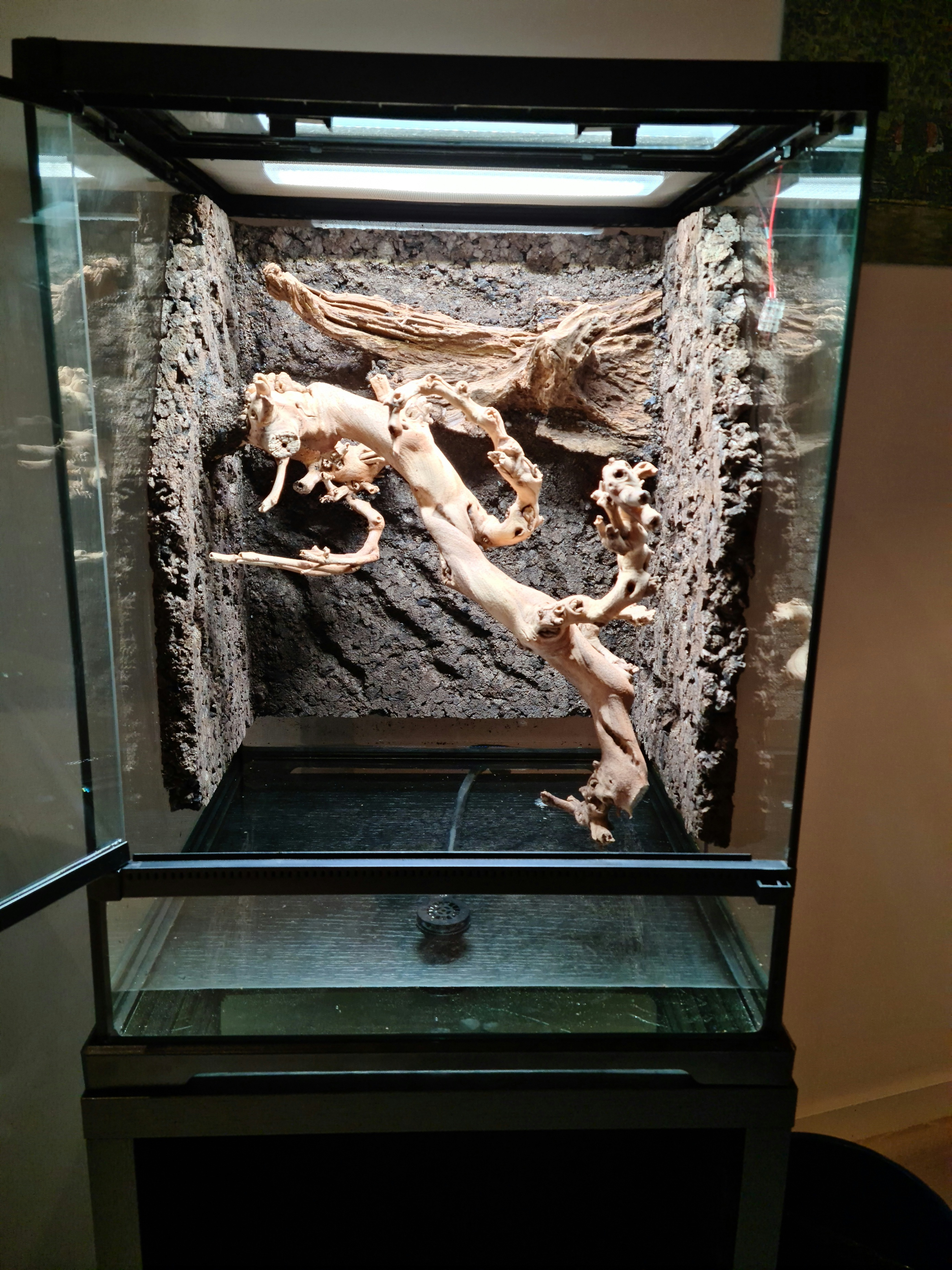 De stora skillnaderna är att det bara är nätvent i halva toppen, resten är plast och glas. Tror inte ventilationen i sig är så mycket flugsäkrare än de andra Exo Terras, möjligen att ventilationen fram är lite tightare, men svårt att avgöra.