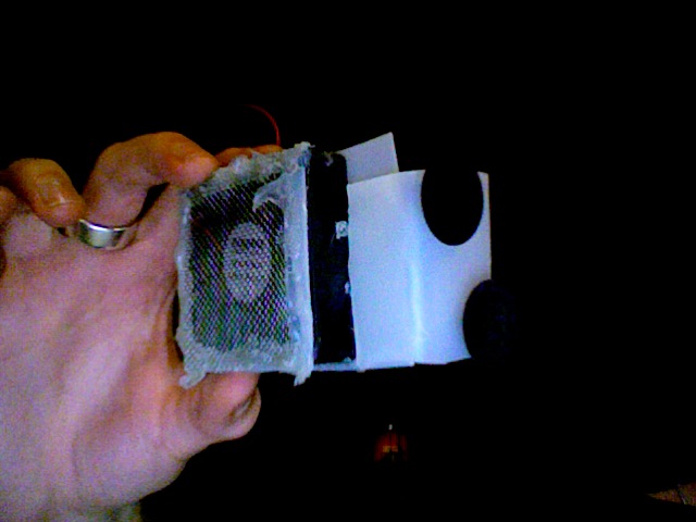 Jo, jag började med att skära ut lagom stora "plastramar" som jag monterade nät på. Den ena biten är längre än den andra. Den långa biten böjde jag till och skar ut mönster och satte dit sugkoppar som har används till akvariefilter.