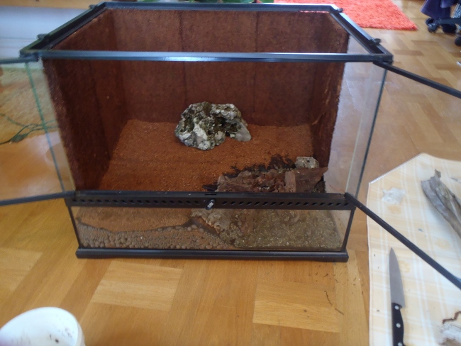 Idag satte jag igång med inredning av det första terrariet som fick bli hem till Galacterna. Terrarierna ska stå kant i kant med varandra så det ska vara liknande inredning i de båda burkarna.