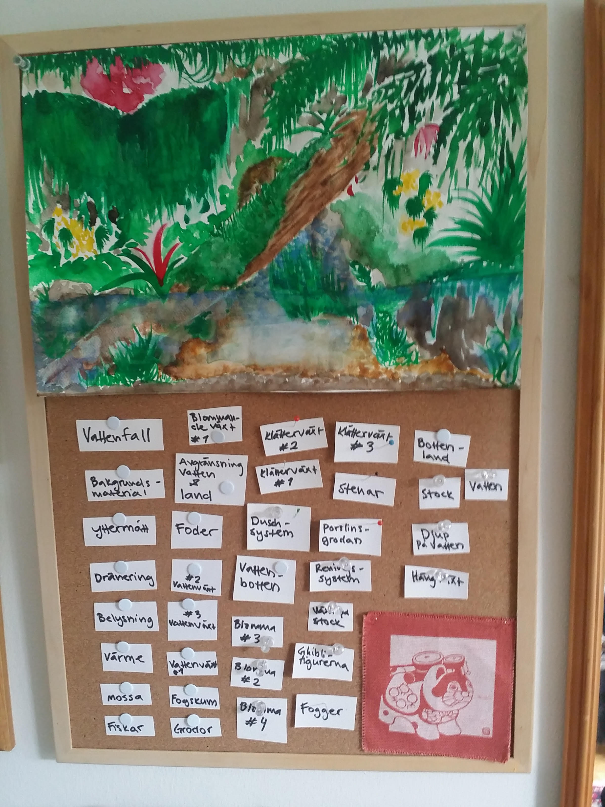 Jag har tänkt mig lapparna som områden som jag behöver lära mig om och när jag känner att jag har lärt mig nog om det ämnet så plockar jag ner lappen från tavlan och sätter in den information jag har hittat i en pärm så att jag kan gå tillbaka och läsa ifall jag glömmer någonting. Jag vill verkligen försöka återskapa en regnskogsmiljö så fint jag bara kan och det får ta flera år om det är så, ju mer fix desto roligare tycker jag. Jag vet att det förmodligen vore mer förnuftigt att starta med ett litet terrarium och utan avancerade detaljer, men då kommer jag antagligen min passion avta så jag väljer att börja stort och låta det ta den tid och de engagemang det nu må ta.