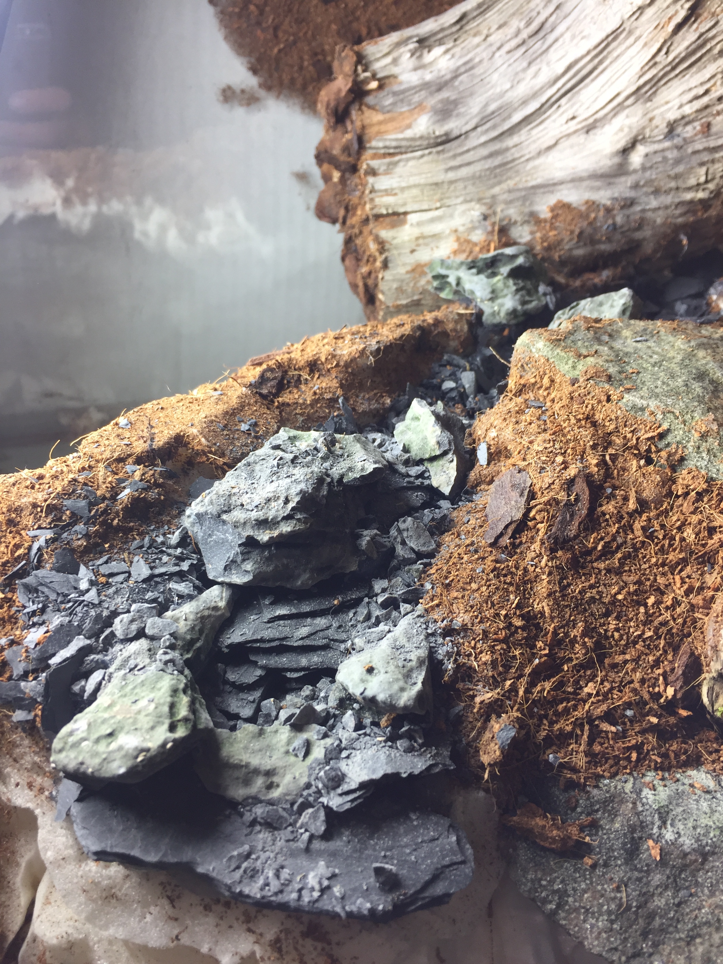 Jag har precis slått sönder en sten som jag haft i ena akvariet och silikonat fast några bitar i ”bäcken”. Tycker det blev mycket bra.