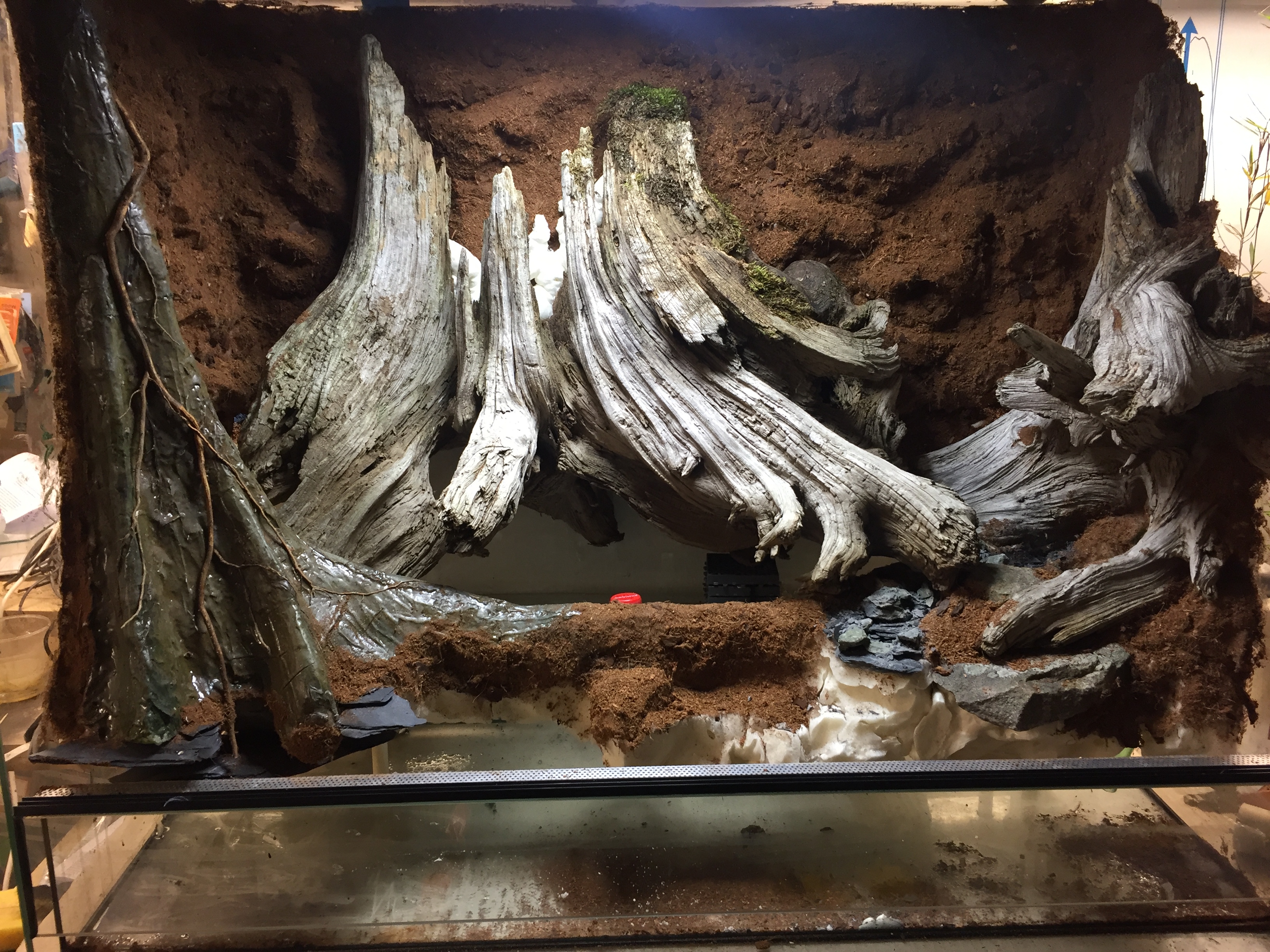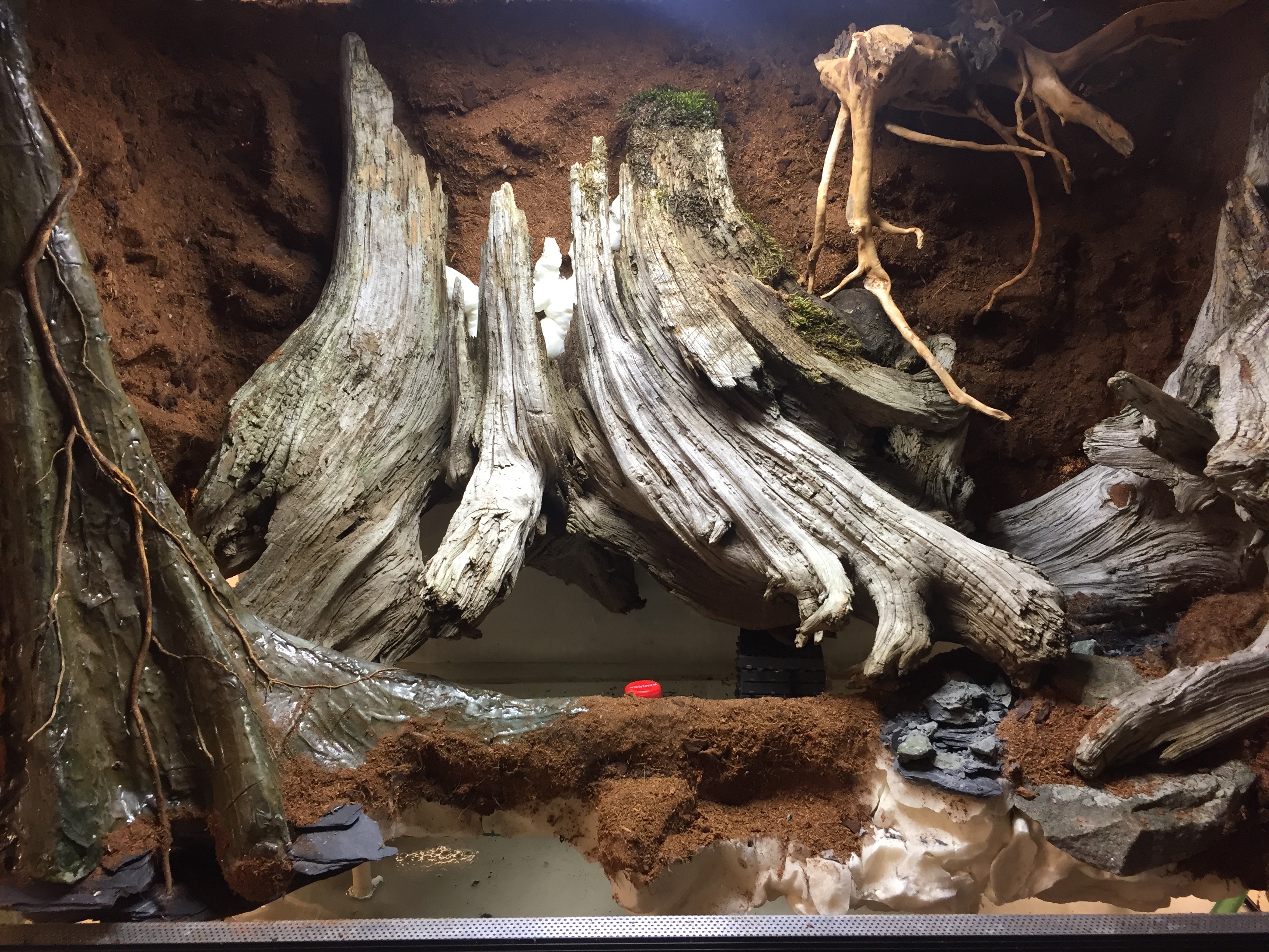 Köpte en redmoor rot härom dagen som jag tyckte såg ut att kunna passa i terrariet. Men jag är lite tveksam till om jag ska använda den. Tycker att det ger ett lite stökigt intryck med så mycket olika träslag. Men det kanske mjukas upp tillräckligt när mossa och växter kommer på plats. Jag bifogar en bild utan roten, och en bild med, så får ni gärna skriva vad ni tycker? Trevlig kväll!