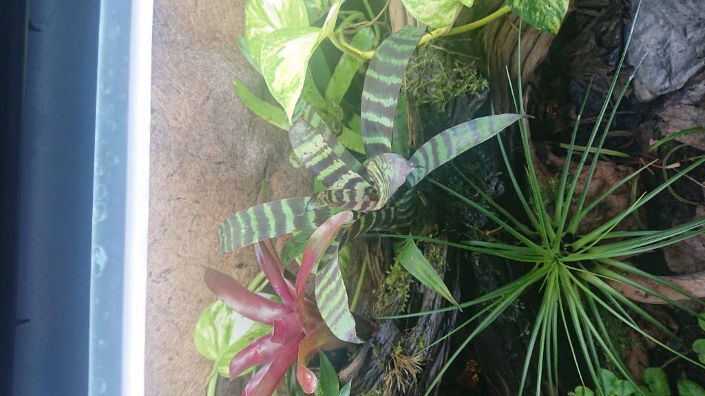 Eftersom vi oftast har ganska svagt ljus i våra terrarier blir bla bromeliorna lite förvuxna. Så räkna med att den blir stor. Vill du ta bort den så försök klippa av (inte bort) rötterna som fäster den vid underlaget. Sedan kan du plantera den i en kruka.