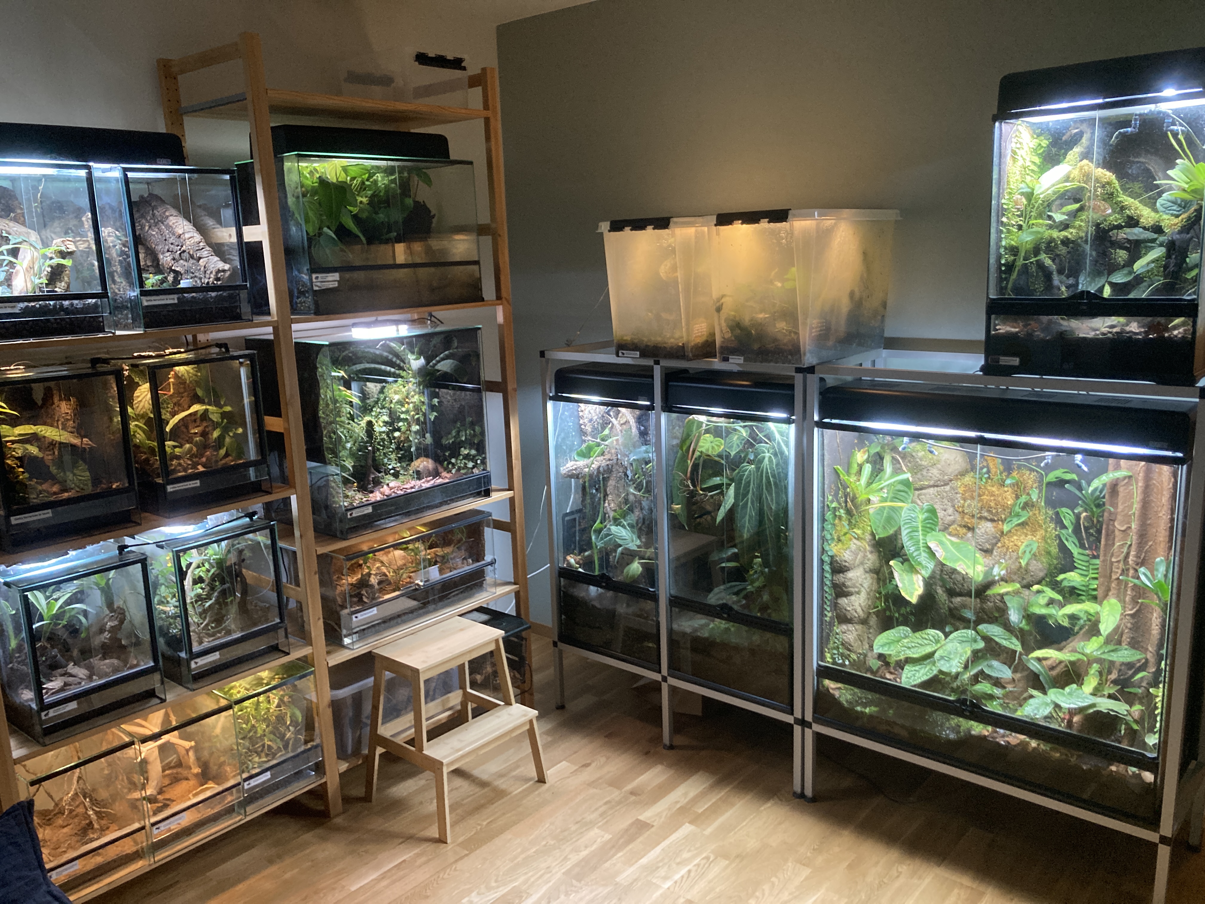 Jag håller D. tinctorius Azureus, D. leucomelas Guyana Banded, P. vittatus, E. anthonyi Rio Daule/Göteborg, O. pumilio Punta Laurel, R. variabilis Franska Guyana, R. reticulata och R. sirensis Contamana. Utöver grodorna har jag även en ögonfransgecko, jungfrugeckor och några fågelspindlar.