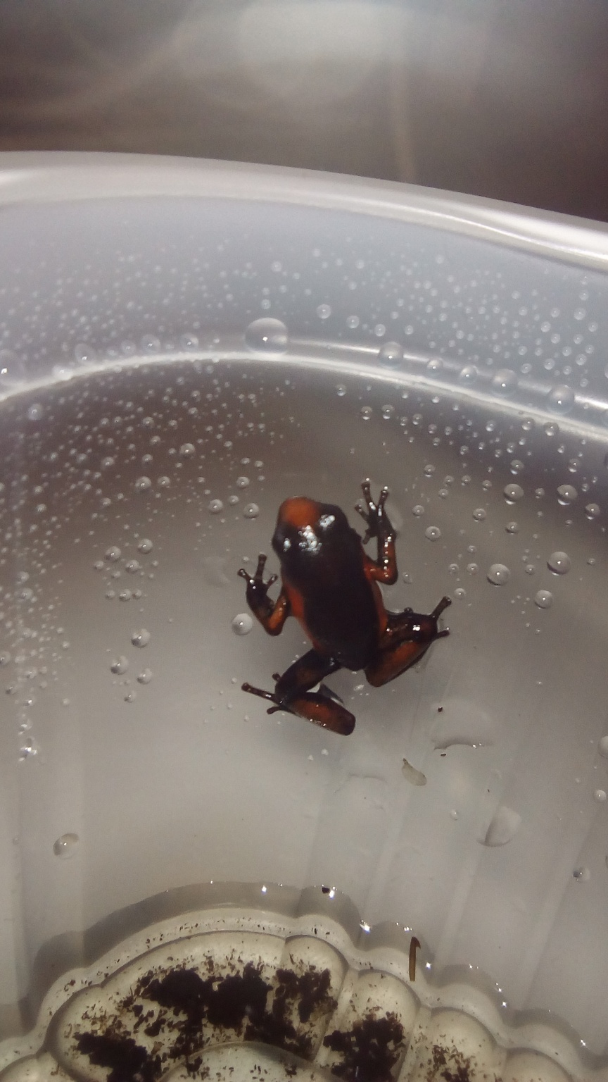 Vad det gäller dom svarta så bytte jag ut växterna i deras terrarium idag då jag har fått in sköldbladlöss. Jag plockade ut alla växter utom en bromelia där det finns ett yngel som håller på att växa till sig och till min förvåning satt det en ny liten groda i en filmburk. Kul att honan tagit bra hand om ett annat yngel också.