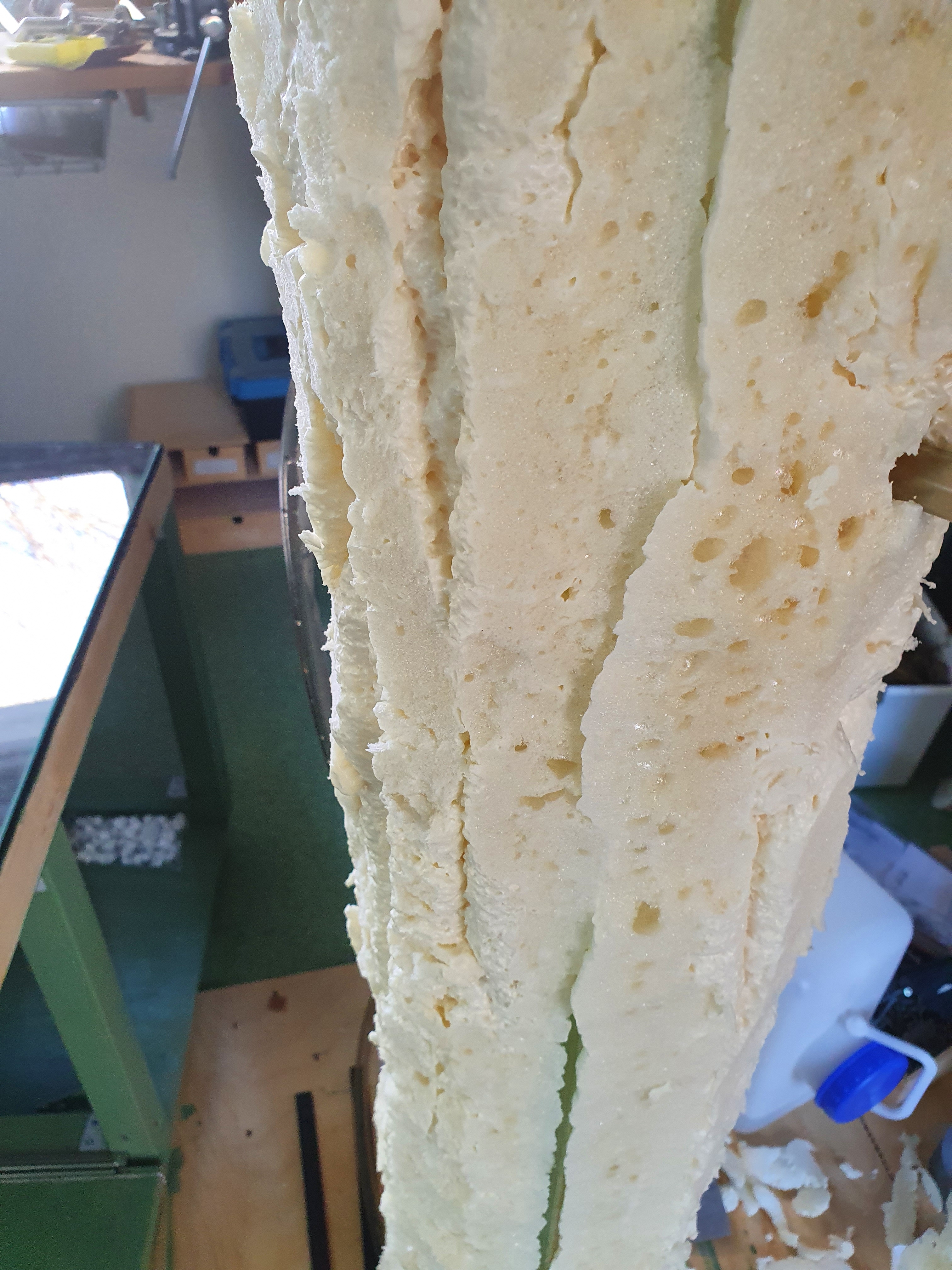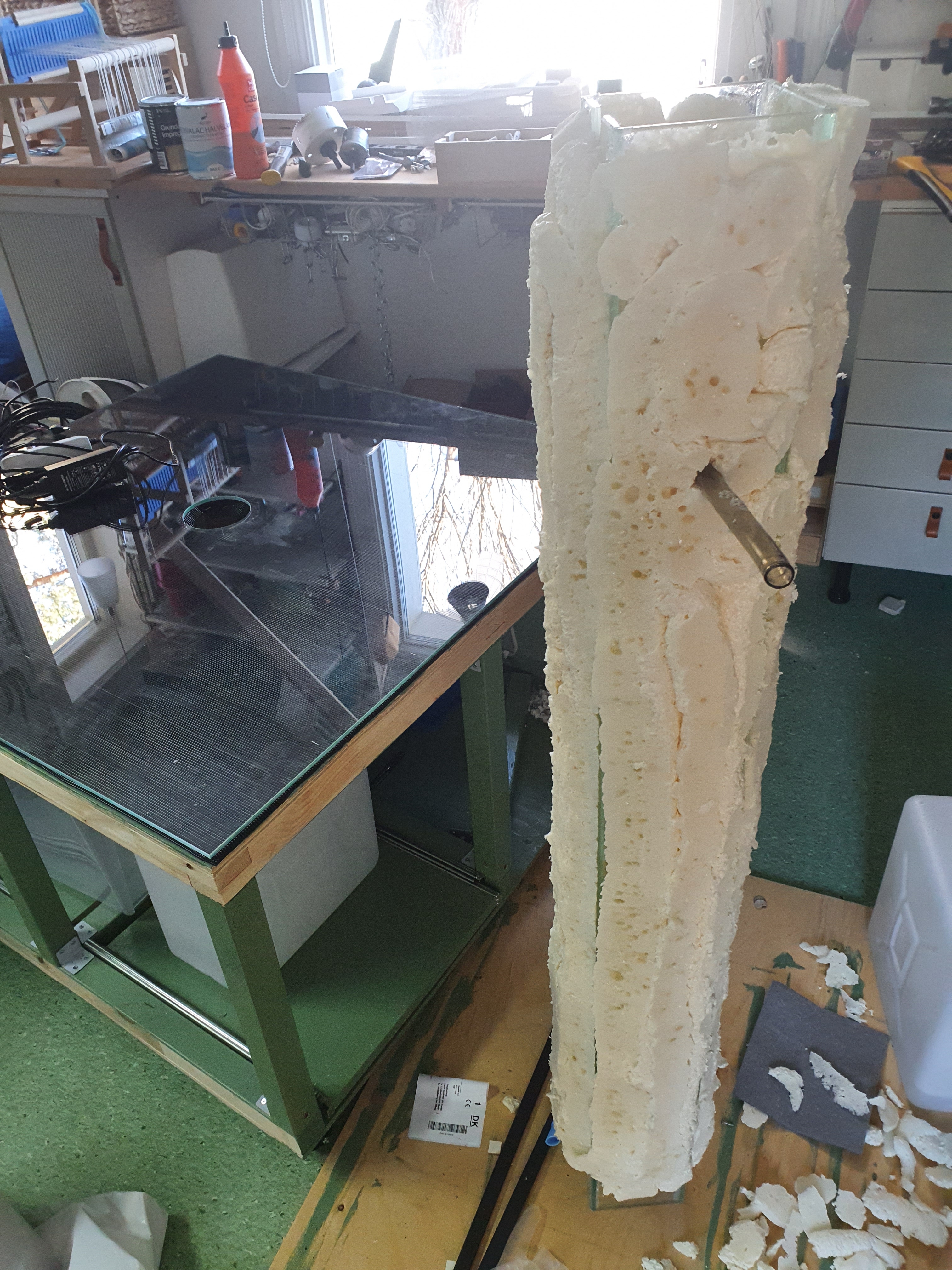 Nästa steg var att börja forma det mer likt en trädstam. Jag använde en klassiker dvs. fogskum. Det var lättare att göra detta första lager när den låg ner för att undvika att det droppar ner så mycket. Sedan var det bara att göra ett första stab på att få den lite rund. Tycker själv att det ser lovande ut!