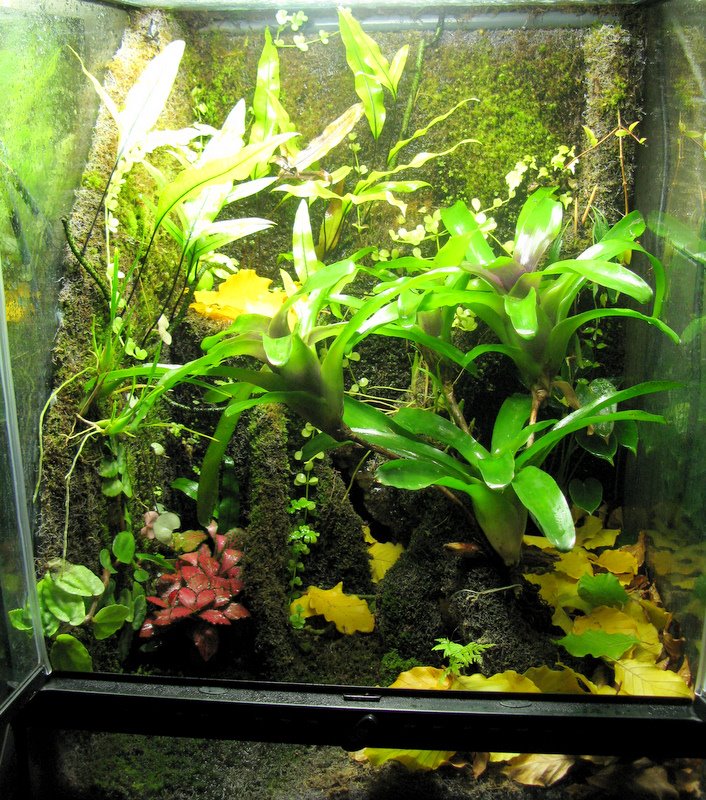 Så här efter groddagen har bromelian och de två O.pumilio "Cauchero" jag införskaffade fått flytta in i terrariet. Just nu är boklöven otroligt gula och vakra så jag kunde inte motstå att lägga in några i terrariet.