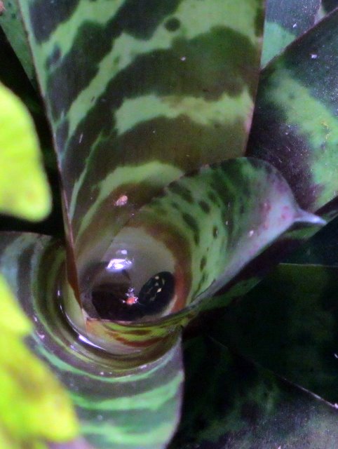 Här om dagen vandrade en av mina R. variabilis hanar omkring med ett yngel på ryggen. I terrariet har jag två filmburkar och ett uppochnedvänt kokosnötskal med vatten för hanarna att lämna av sina yngel. Jag har länge tänkt att prova att låta ett yngel få växa upp i kokosnötsskalet i terrariet och bara väntat på att ett yngel ska bli lämnat i det. När han inte hade ynglet på ryggen längre tittade jag efter i dessa vattensamlingar men har inte kunnat hitta det. Då tittade jag efter i bladrosetten på bromelian för att se om ynglet kanske blivit lämnat där. Då fann jag detta yngel som har klarat sig där alldeles själv utan att jag har matat det medvetet. Som ni ser så har ryggtäckningen börjat framträda. Bakbenen har också börjat komma fram. I storlek skulle jag gissa att det i sin utveckling är ca 1,5 månader gammalt men kanske är det betydligt äldre eftersom det har fått överleva endast på det som ramlar ner i vattnet. Eftersom ynglet har klarat sig så bra hitintills tänkte jag låta det vara kvar där det är och inte stödutfodra det och se hur det går.