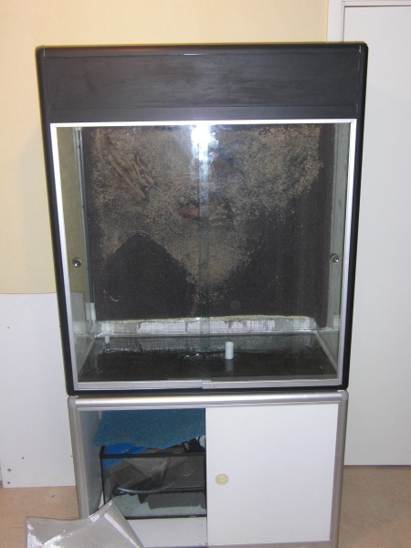 Kör det som ett saltakvarie med en sump under akvareiet. Då kan man MYCKET lättare komma till pump om den sätter igen, sen om terrariet blir lite kalt ja då slänger du i en doppis bara i sumpen...