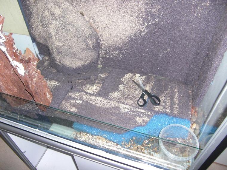 bilder na visar hur jag har byggt upp botten med hjälp af filter matta och epiweb. denna har sedan täkts med min egen "djungelblandning" bestående av löv, mossa, torv, orchidejord, och reptilbark(?).