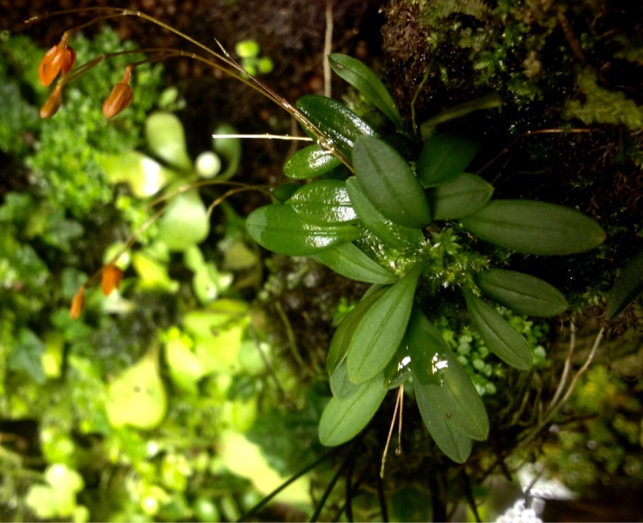 Bulbophyllum lepidum blommar överallt hos mig just nu. Här syns blomman från undersidan (ingen stor skillnad mot ovansidan dock).