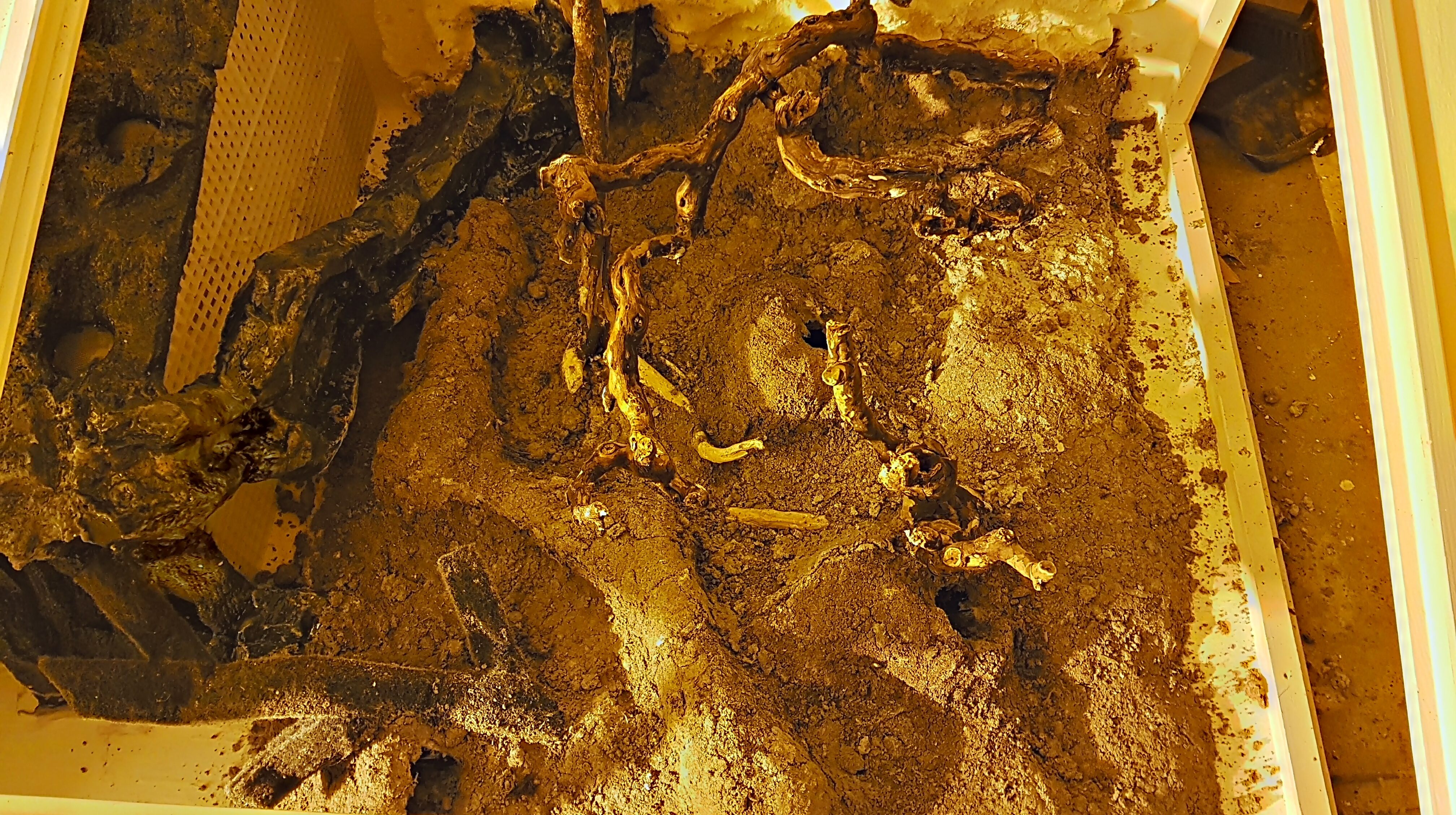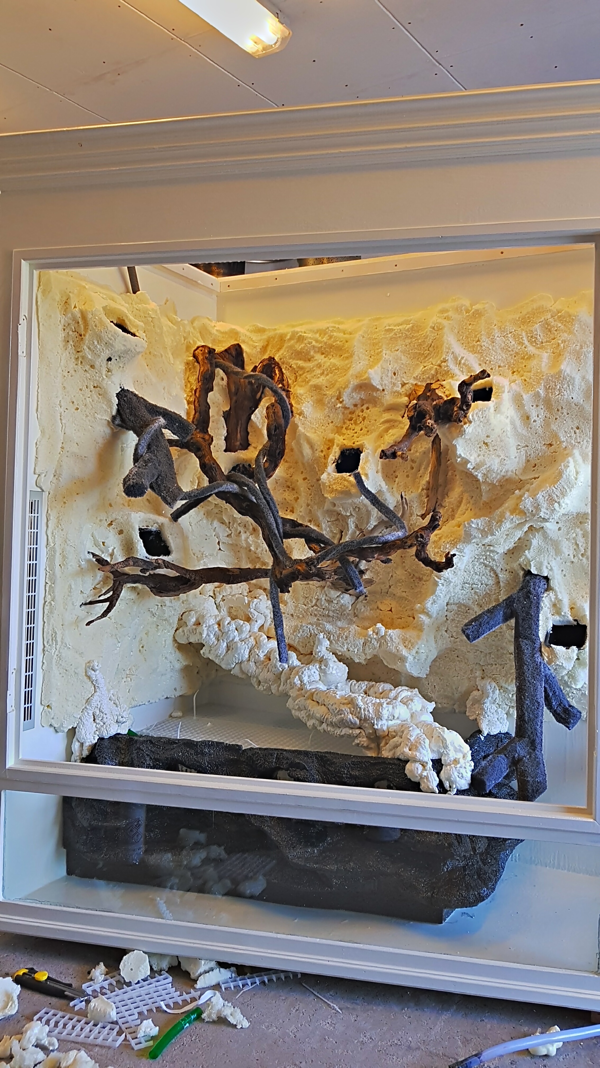 Hygrolon runt bromeliors rötter låter inte bra. De får under inga omständigheter ha blöta fötter, då dör de snabbt. Bromelior använder inte rötterna för att suga vatten, de samlar det vatten de behöver i kronan. Rötterna är bara till för att hålla dem på plats. Jag fäster växter på bakgrunden med tjock plastöverdragen ståltråd. När de växt fast är det bara att ta bort. De bör inte vara kvar för länge då de kan rosta och läcka järn.