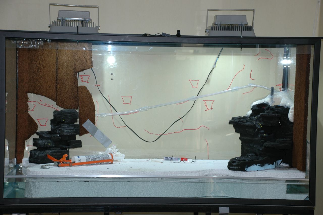 Fattar inte heller. Vattnet hittar antagligen en väg ned till frigolittaket på hyllan. Och sen är inte frigoliten tät. Och dessutom vidare så det kommer ut genom hålet på sidan av terrariet. Rivit och börjat om. Sonen har lärt sig nya intressanta ord idag. Bauhaus har numera slut på silikon i Uppsala.