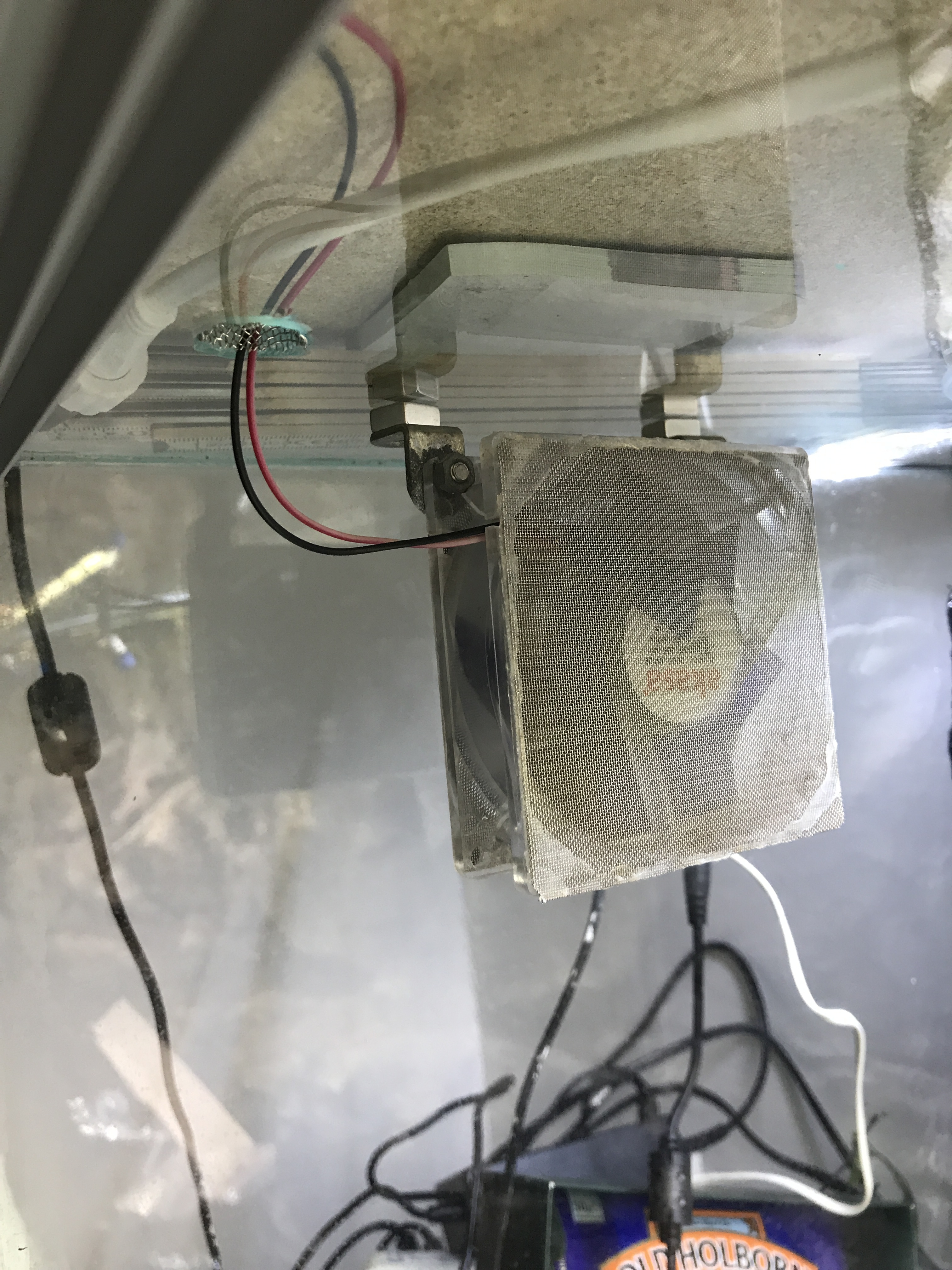 1. Kan du visa hur du installerar fläktar inne i terrariet? Jag behöver installera fläktar för cirkulation. Mina orkidéer dör, i alla fall några av dem. Behöver cirkulera luften. Det jag undrar är, dels hur du fäster, dels var du fäster (i förhållande till dysor och indirekt regnstänk), dels hur du tar in ström? Jag har, som du ju vet, en himla massa borr, så jag skulle kunna borra 3mm-hål i tak eller sida, för att precis där fläkt skall sitta, gå in med kablage. Hur gör du?