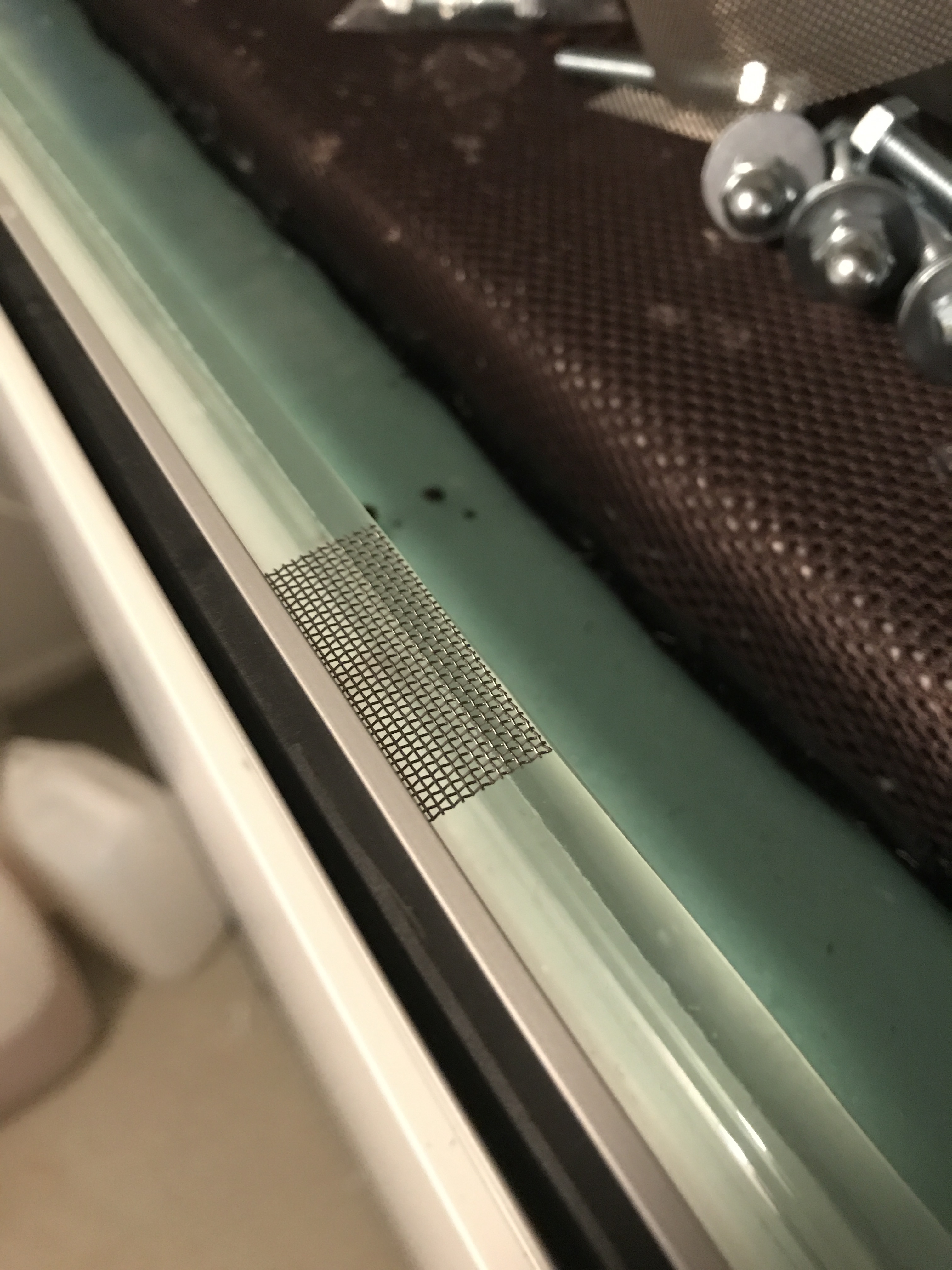 Däst med skruvar eller lödkolv mot nätet som värms upp och smälter in i fläktram. Kan även limma på nätet.