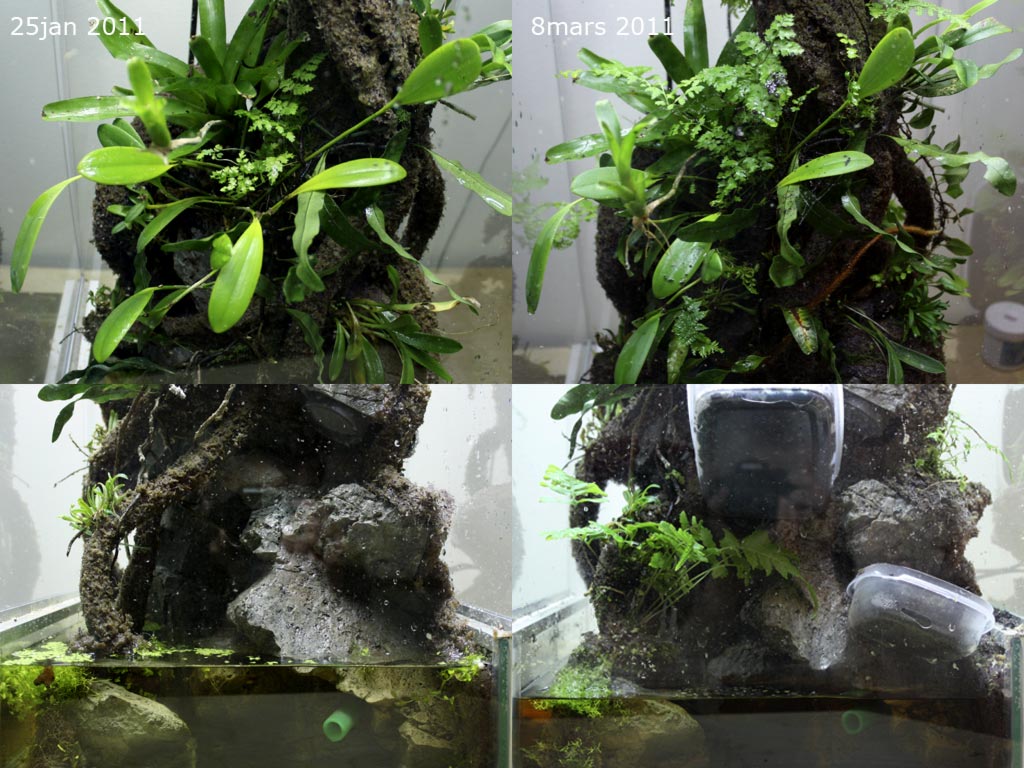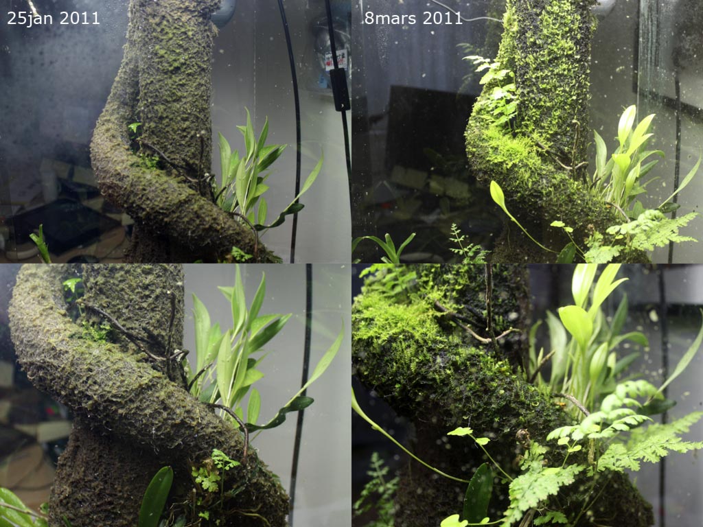 Till höger om stammen syns favorit orkiden, syns rätt bra hur den växt till sig.<br />Av någon anledning gillar grodorna att sitta på bladen, har sett alla tre sitta på olika blad av den samtidigt.