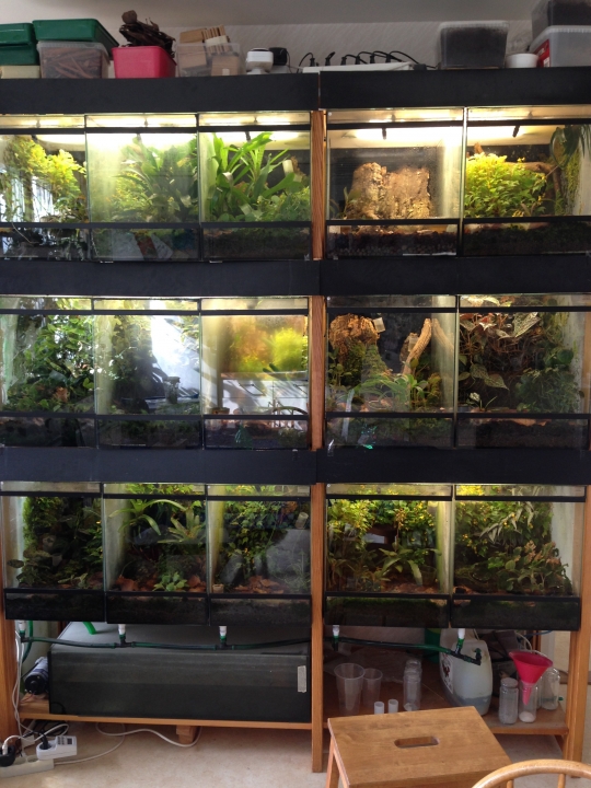 Tänkte börja tvinga på er lite om mina burkar och grodor mm. Bilder kommer till största delen vara mobiltagna. Det får ni stå ut med. Börjar med en bild på "kökshyllan". Jag är odlare och samlare så burkarna är rätt kompakta så jag får plats med fler. Ca 35-40 breda 45 höga och 55 djupa.