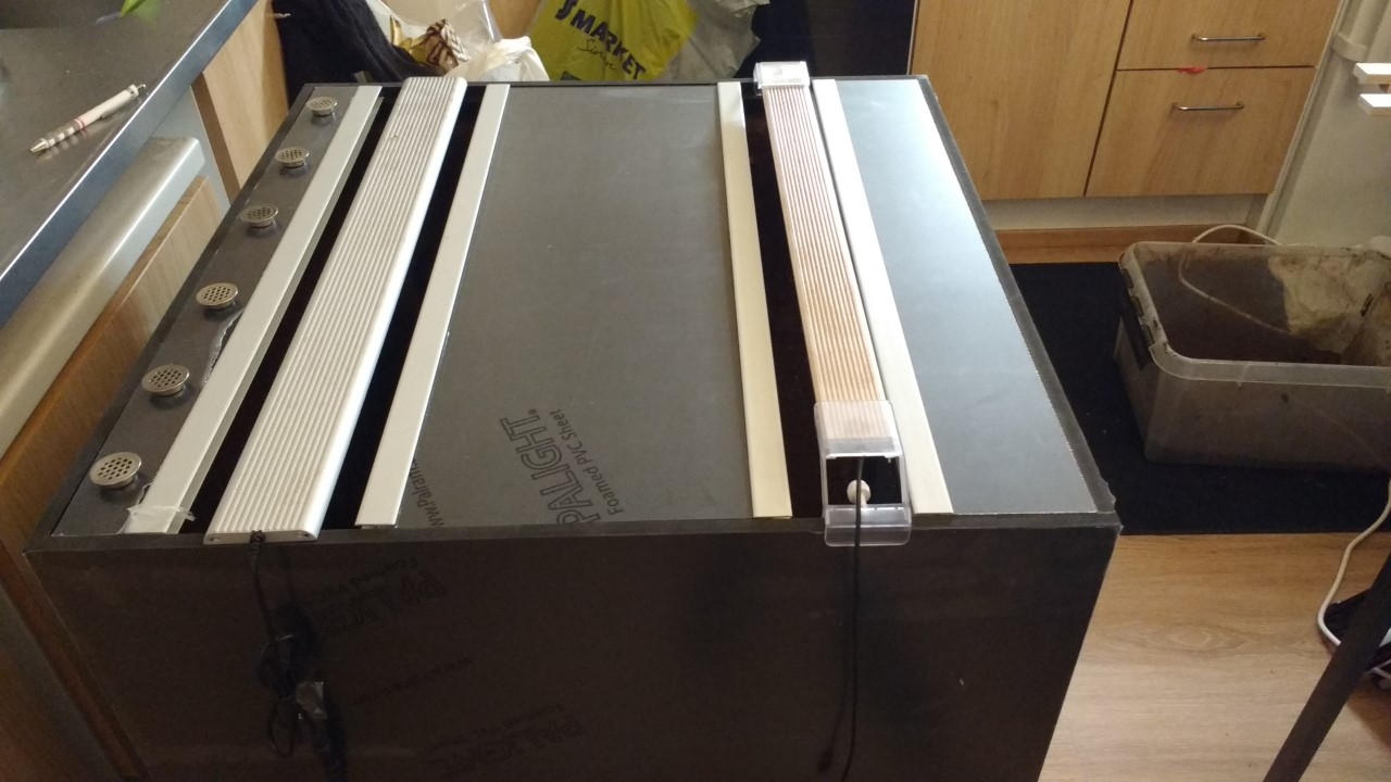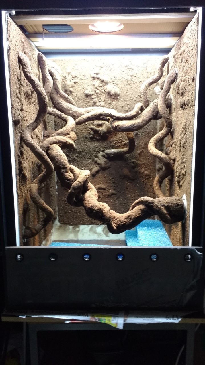Jag har byggt mitt första terrarium i svart pvc "foam board" och kommer att bygga alla terrarierna i det materialet. Taket består av det materialet också. Det finns hål för belysningen fram och bak men i mitten av taket kommer det dessutom att bli en spot för växterna samt en uv spot (samt rum för eventuell kylanordning). Storleken är 60x60 botten och 90 höga. "foam boarden är 10mm tjock och för att få det så enhetligt och snyggt som möjligt vill jag ha glas endast i hålen för spotten. Det är helt onödigt att vara så noggran ur funktionel synvinkel förståss...men om jag kan vill jag undvika nivåskillnader i taket mellan glas och pvc skivor. ...så jag funderar på olika lösningar. 4 mm glas var det som fanns hos den glasmästare jag kollade med idag. Där var priset för en 4 mm optiwhite bit på 20x45 cm ca 250 kr. På tio terrarier blir det ändå en utgift på 2500kr som känns onödig om det inte uppfyller sitt syfte. Jag funderar alltså också på att ha nät vid uv spotten men undrar hur spotten mår när den utsätts för onstant fuktighet osv.