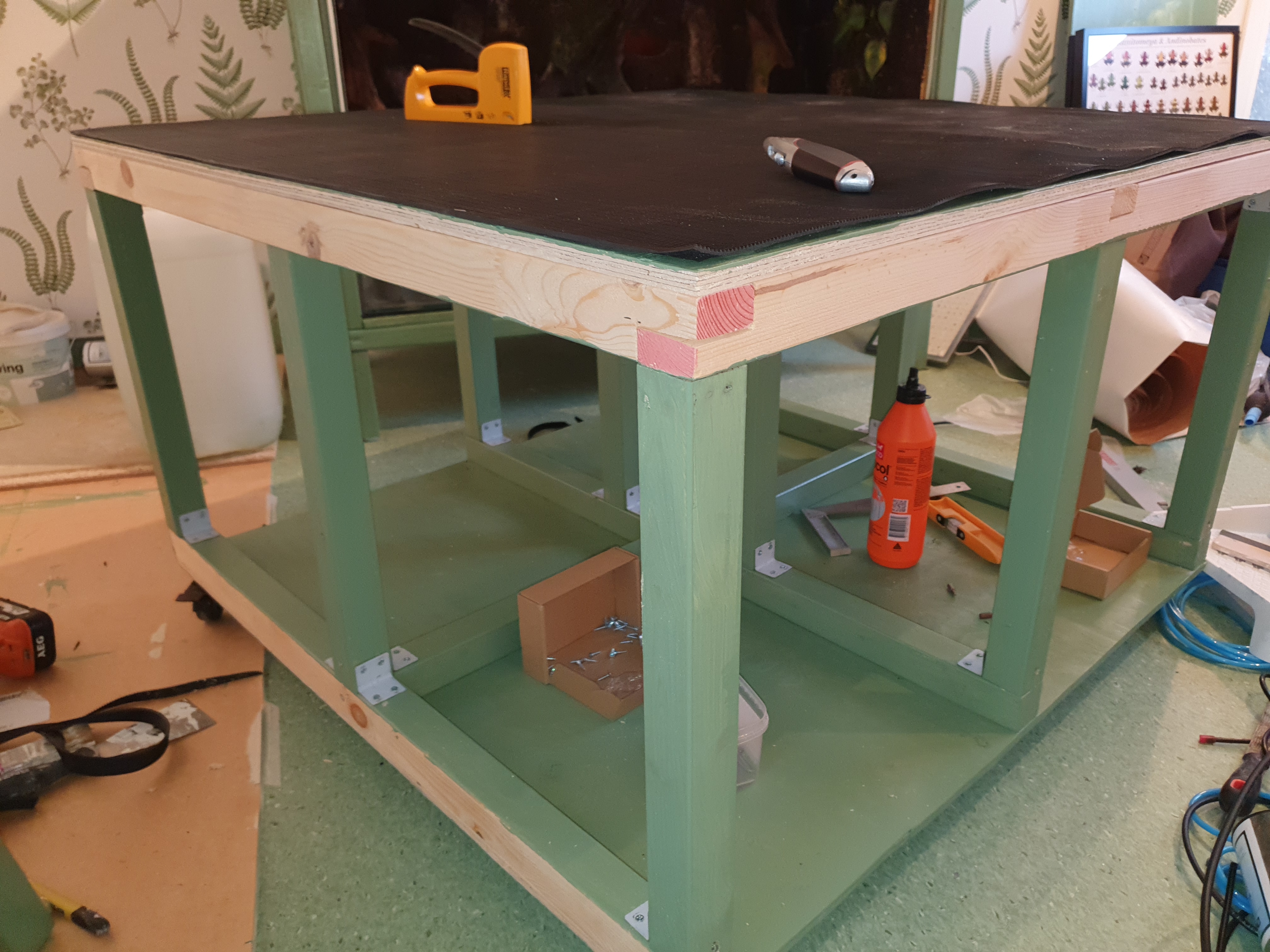 Första delen av bygget är att skapa sockeln som burken ska stå på. Bygger den av 45x45 reglar och plywood som jag måla. Sjukt mycket måla blir det och min fru kommer med glada till rop som t.ex. "Det ser ut som när våra barn målade på dagis" vilket jag kanske inte tror är en komplimang. Byggde toppen och botten separat och sedan monterade ihop dem i ett nästa steg. Ihopsatta. Det ska mer än väl hålla för vikten av burken och all teknik. I sockeln kommer jag ha plats för det som behövs för regnsystem, elinstallationer, avrinning/sump och annat smått och gott som jag kommer visa allt eftersom de kommer på plats. Den kommer kläs in i plywood så det kommer inte vara öppet under när allt är klart. Eftersom den kommer stå mitt i rummet har jag valt att ställa hela sockeln på rejäla industrihjul som har låsmekanism. De klarar 300kg styck så de kommer också hålla. Har redan testat dem på min näst största burk 120x50x70 och hjulen var riktigt smidiga när jag rullade runt den.