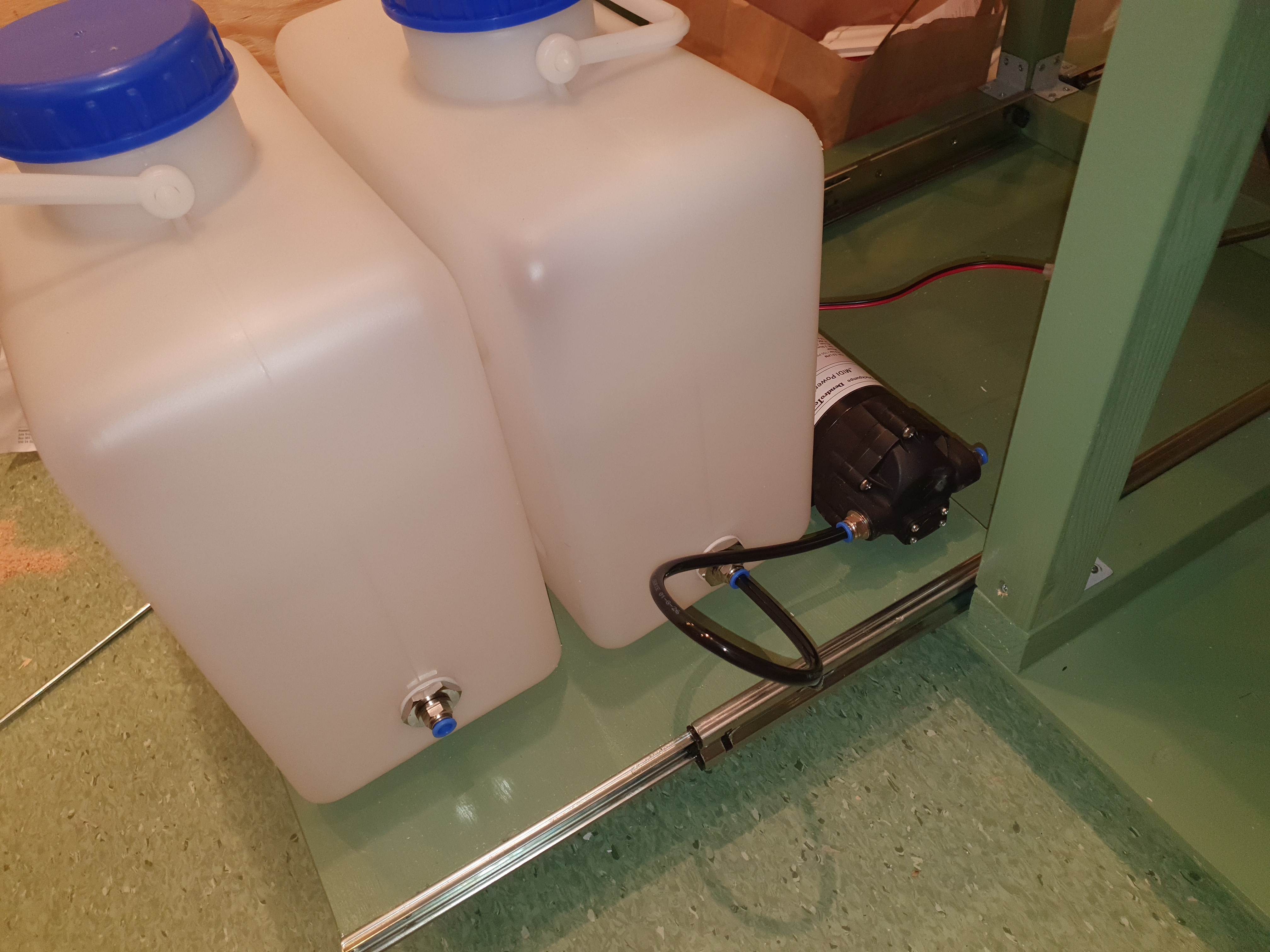dit jag kommer leda ner vattnet från burken via en genomföring och rör. Första gången jag själv limmar PVC också faktiskt men med Tangit rengöring och lim kommer det nog gå galant. Vattennivån i burken kommer var ca 5 cm så när det går över det kommer det att rinna ner i sumpen. Även sumpen står i en utdragbar låda så att det ska gå att både fylla på, byta vatten och rengöra sumpen. I sumpen finns också pumpen som kommer driva ett potentiellt vattenfall och potentiell "droppvägg".