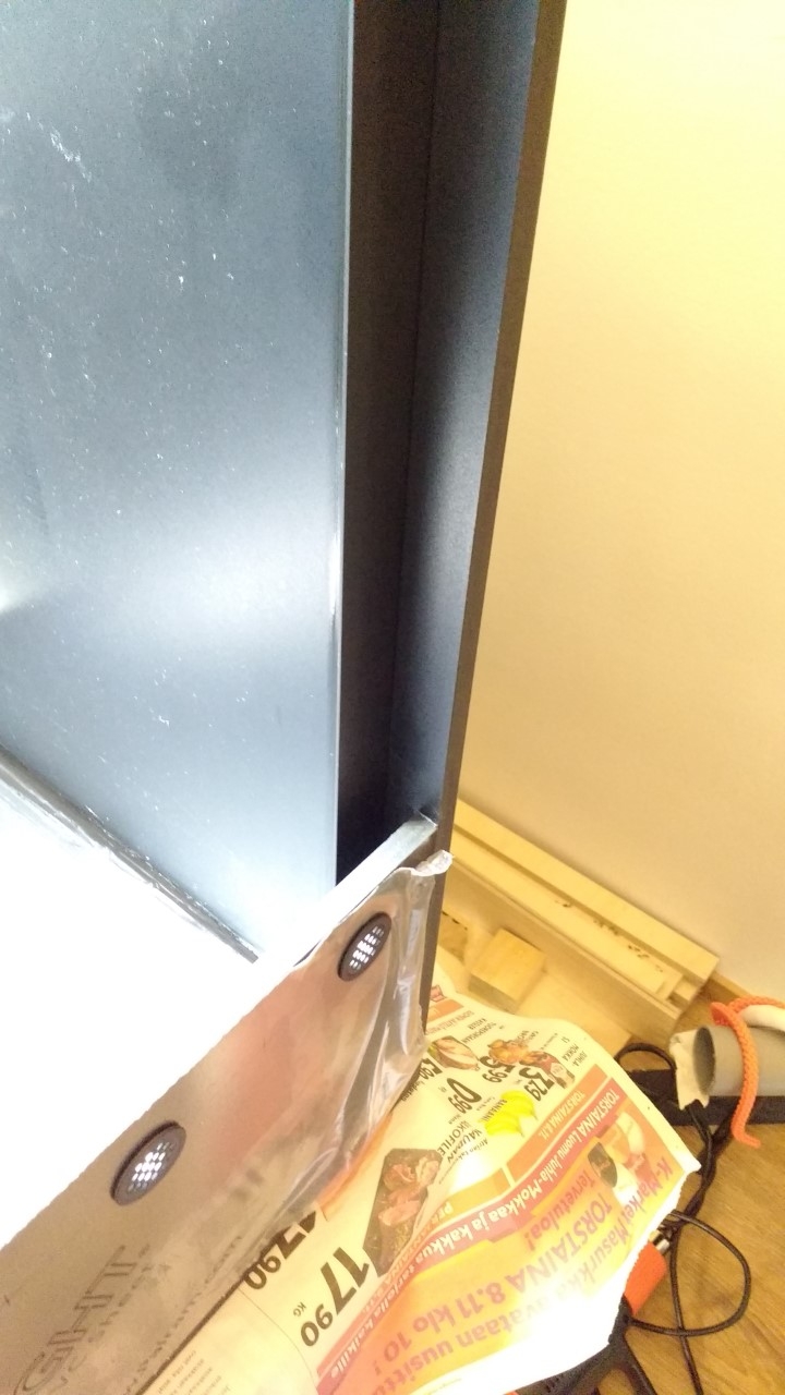 Jag har byggt mitt första terrarium i svart pvc "foam board" och kommer att bygga alla terrarierna i det materialet. Taket består av det materialet också. Det finns hål för belysningen fram och bak men i mitten av taket kommer det dessutom att bli en spot för växterna samt en uv spot (samt rum för ...