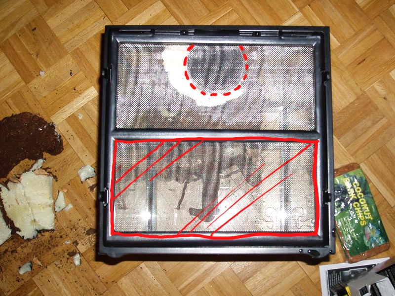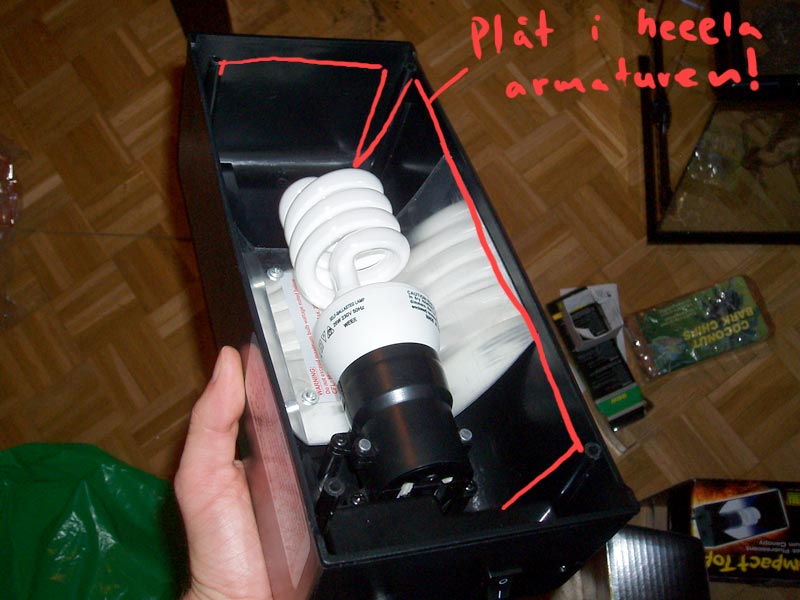 Terrariumets top måste moddas med ett täckglas istället för nät under lampan. Nätet tar upp lite för mycket ljus och lampan behöver all sin kapacitet. Sedan behöver armaturen moddas med en ny reflektor, den plåtbiten som satt i va inte mycket att ha. Varför har dom inte gjort den större och bättre reflektor?!
