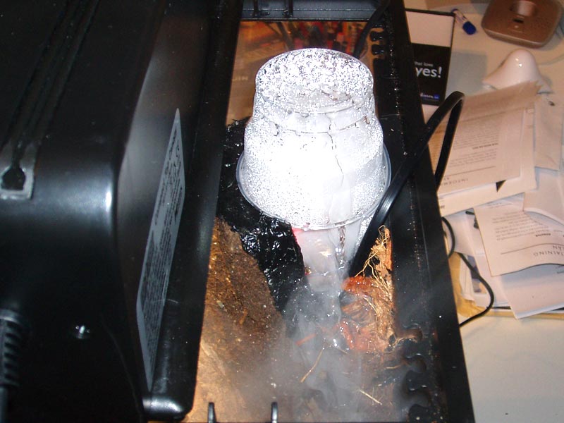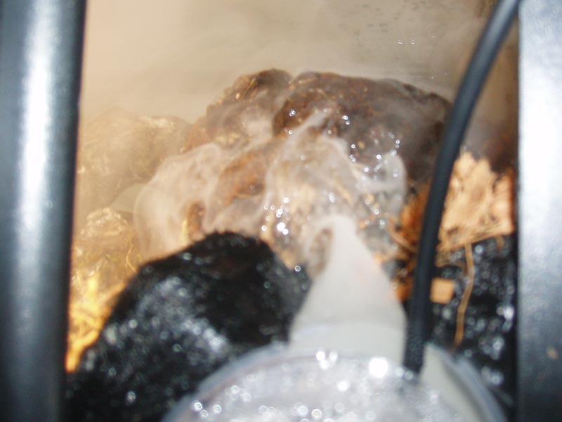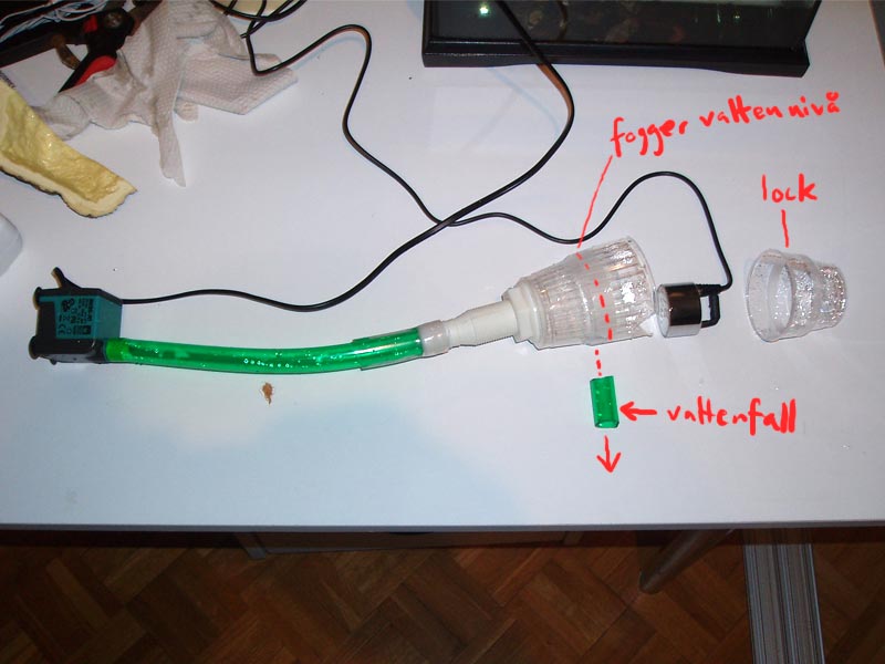 Byggde en temporär testmodell av hur jag tänkte lösa fogger-bygget. Själva fogger-generatorn placeras i någon form av burk. Burken har en genomföring i botten och ett utlopp för ett vattenfall i sidan. Vattenfallets utlopp placeras i lagom höjd så att vattenytan blir i lagom höjd för foggern, på så sätt hålls vattenytan där foggern är på en konstant nivå och foggern kan fungera optimalt.