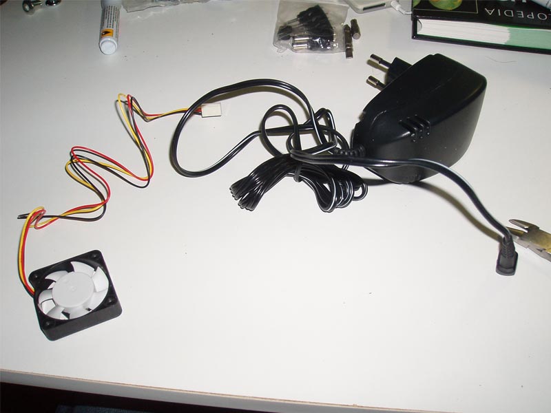 1. Klippte av de tillhörande ändarna på både nätadapter och fläkt.