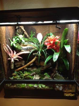 Jag har lite bromelior, en Guzmania som det f n simmar tre yngel i, en rosa Crypthanus, en Neoregalia Liliputiana som gladde mig med en vacker ljusblå blomma idag, Ficus Scandens, och några Begonior.