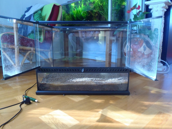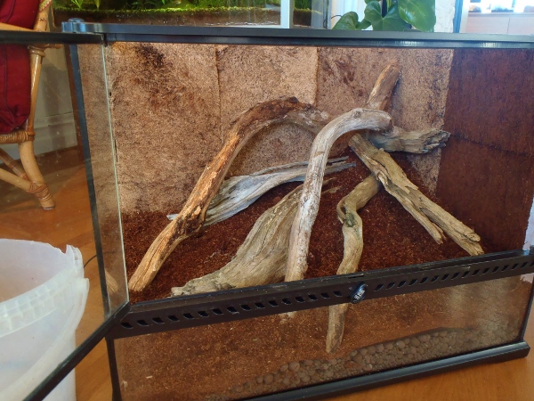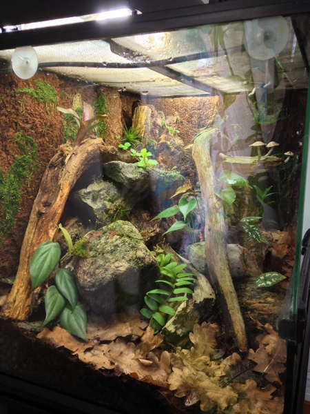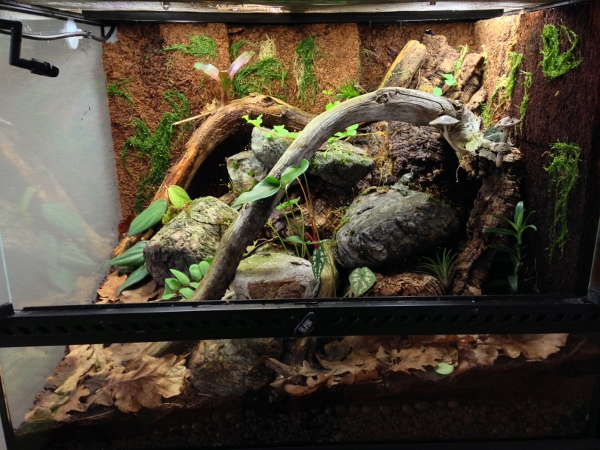 En tanke när jag ser ditt (och många andras) terrarie. Tycker att det är för få gömställen. Jag använder inte xaxim längre men när jag gjorde så lutade jag plattorna mot bakrutan så att grodorna kunde komma in bakom. Ger perfekta, trygga gömställen och ökar ytan i terrariet. Använder korkbark på samma sätt numera. Ett tips!