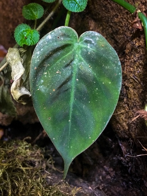 En klättrande Philodendron från Panama. Får decimeterstora mörkgröna sametslika blad. Beskrivning: