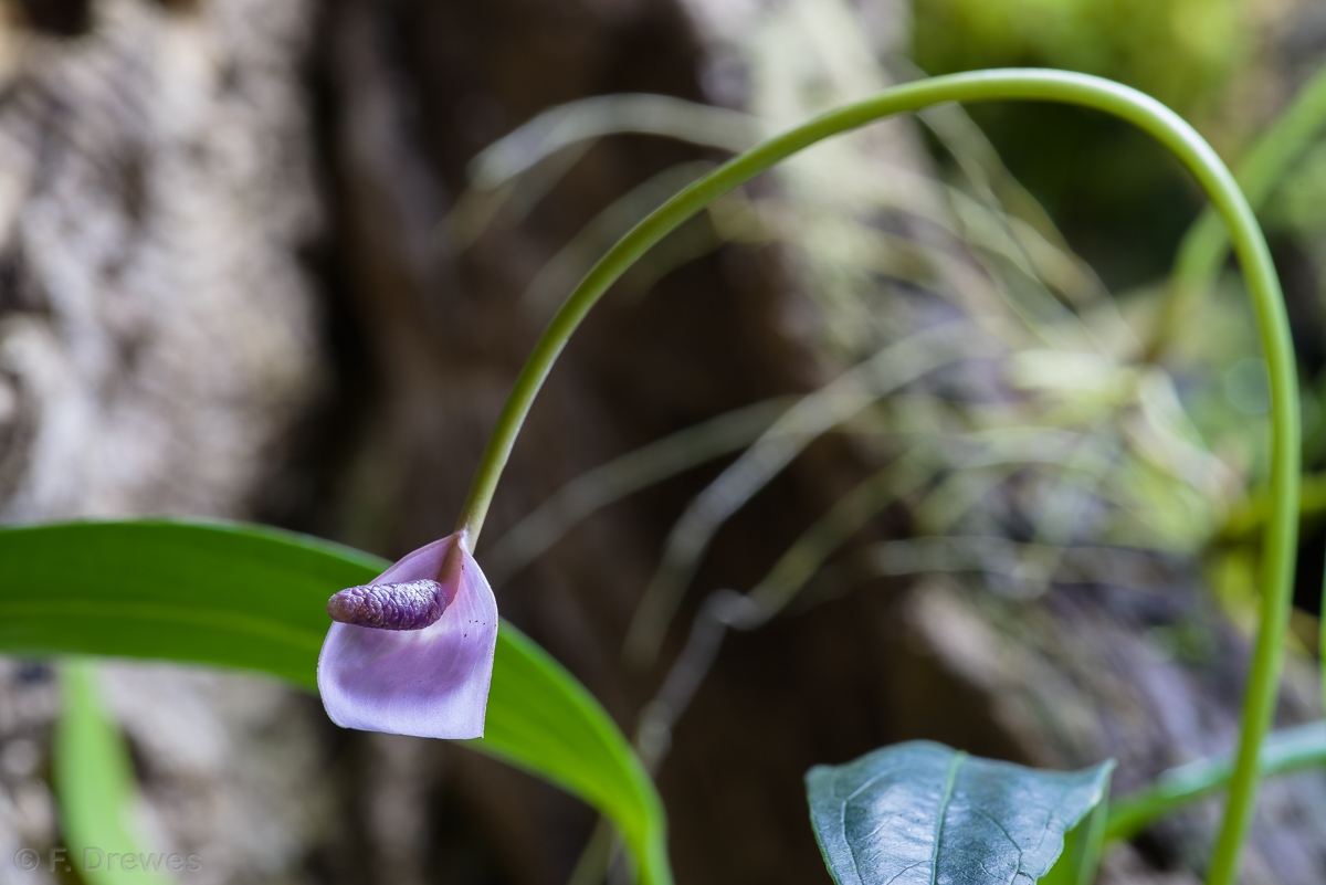 Pleurothallis aspergillum igen. Och ett extremt tjusigt litet Anthurium jag förälskade mig hemma hos Bengt under groddagen. I hans vanliga generositet klippte han av en del, t.o.m. med blomma, som nu växer hos mig. Skulle någon mot förmodan veta artnamnet så skulle jag vara tacksam för ett tips.
