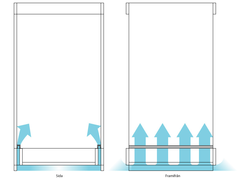 Kall-luften sugs in från botten, genom ventilationslist. Terrariumet står på två av dess egna väggar.