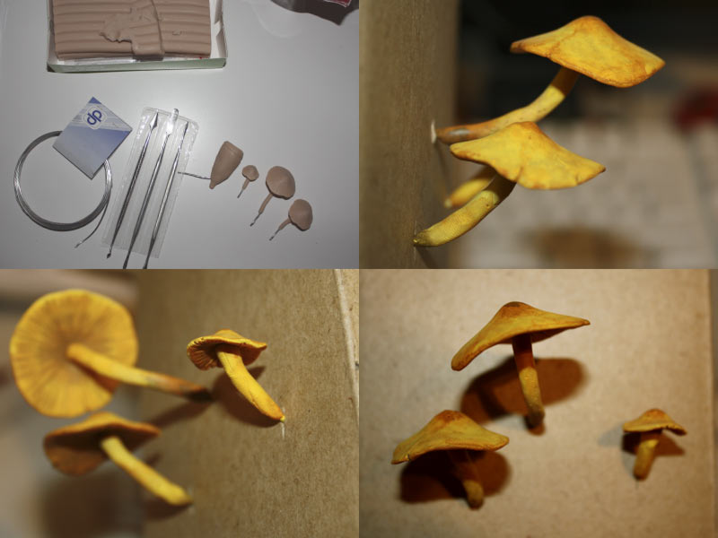 Har tidigare gjort lite små saker i Super sculpey, det är en lera gjort för extremt detaljerade hobbysaker, typ örhängen, modeller, och annat. Leran bränns i ugnen 130grader i ca 15min och sedan blir den stenhård och går att måla. Trodde jag hade lite akvarielack nere i källaren att använda till leran, men den var tyvärr torkad. Hade lite inspiration och tänkte att man kanske kan göra lite svampar eller någonting som skulle kunna fungera som äggplats åt grodorna men var lite snyggare än en filmburk. Då inspirationen flödade gav jag mig på att göra tre små svampar. Resultatet blev rätt bra och detta skulle säkert vara ett kanonsett att göra konstgjorda grenar, tickor, rötter eller andra detaljer av på egen hand. Det blir inte så jädra dyrt, det är lacken och leran som blir den stora kostnaden.