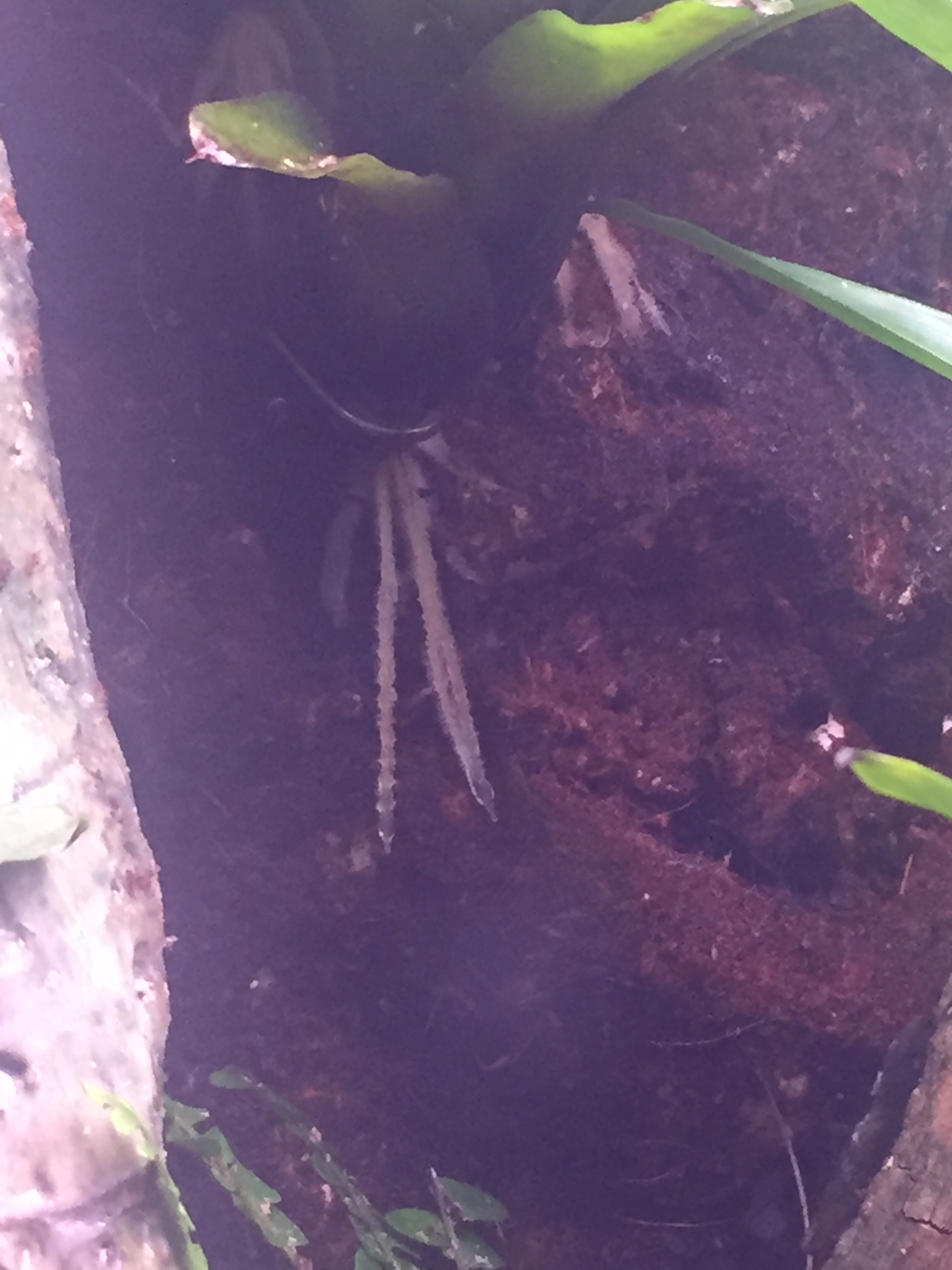 Men intressant nog ändrades detta helt då de kom över i den nya burken. Nu är de nästan aldrig på marken. Visst, de är inte lika graciösa på uppe på bromeliorna som mina rio tigre, men på roten har de inga problem att klättra omkring. Och det är där de uppehåller sig oftast, på roten. Detta tycker jag är intressant då jag i gamla karet trodde att jag skapat möjligheter för dem att kunna klättra uppåt på växter. Men antagligen var dessa för ostabila för att de skulle vilja använda dem. Nu med roten i det nya karet känner de att den är stabil och har ”förvandlats” till klättrande grodor. Tycker det är viktigt att poängtera till de som är nya i hobbyn. Bara för att en grodsort anses vara mest på marken, kan det ändå vara värt (krav) att inreda med stabila grenar eller motsvarande högt upp i karet.