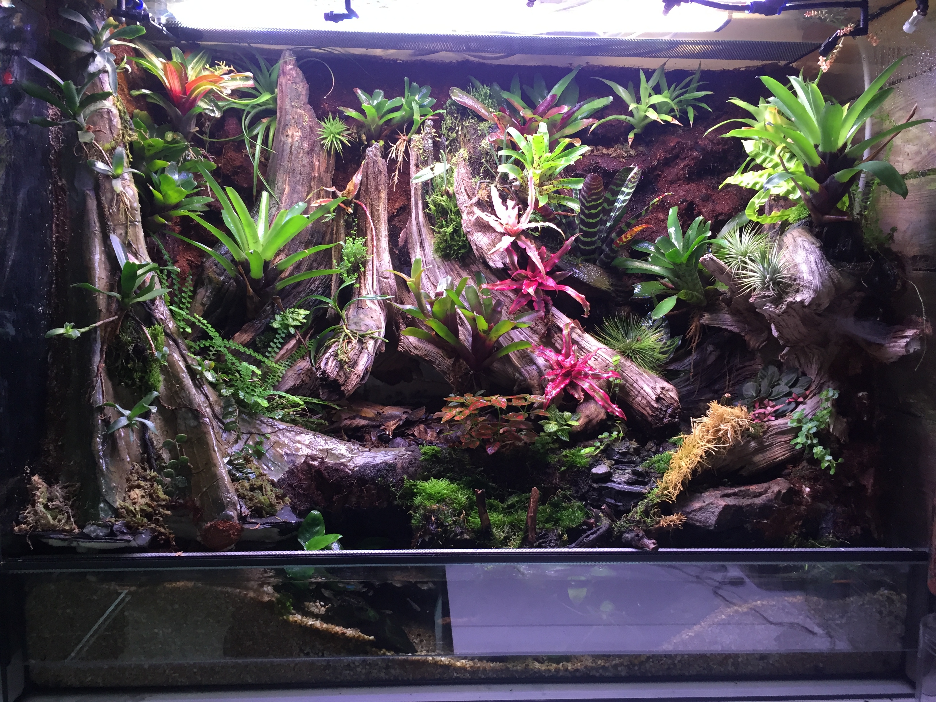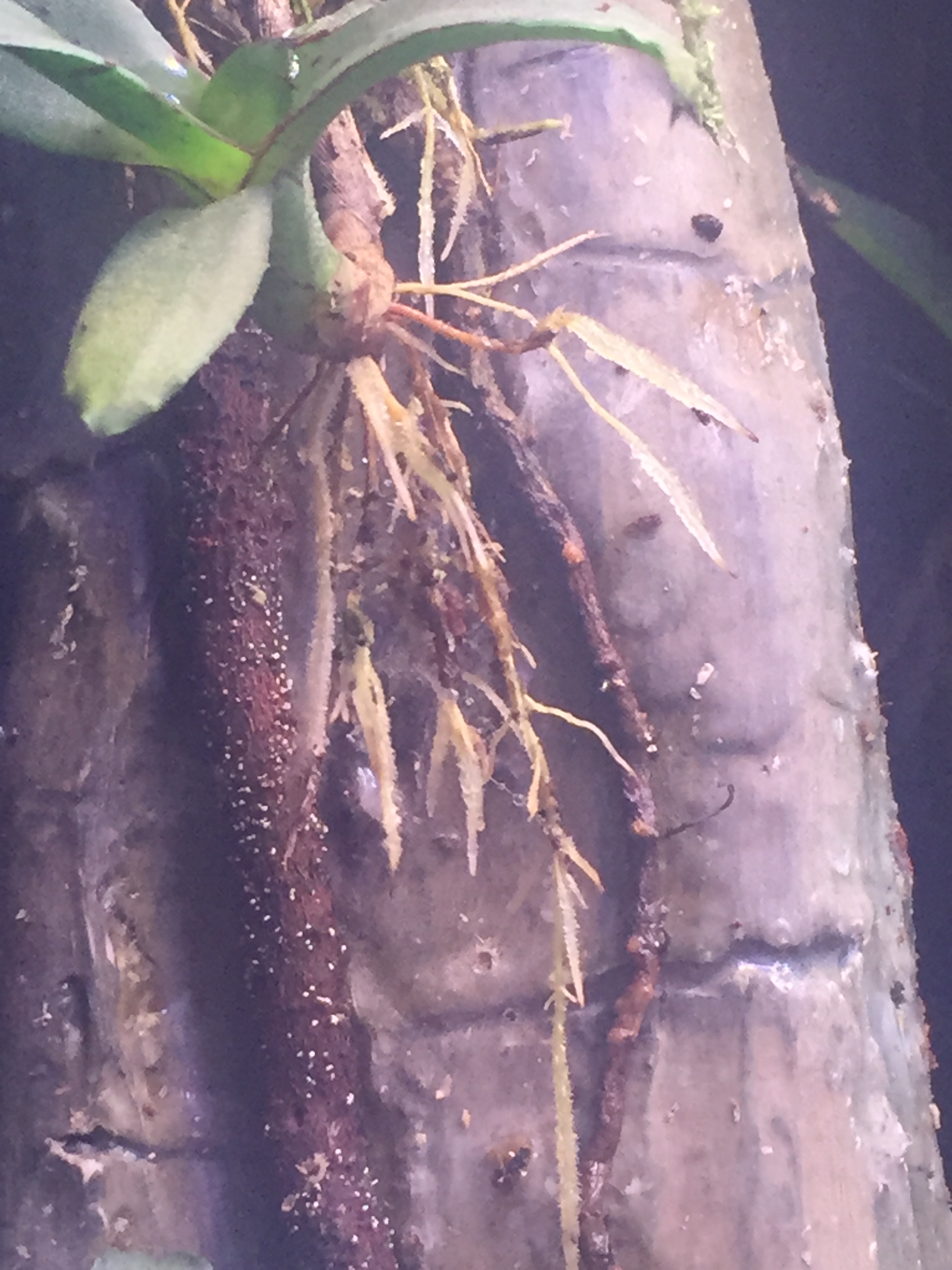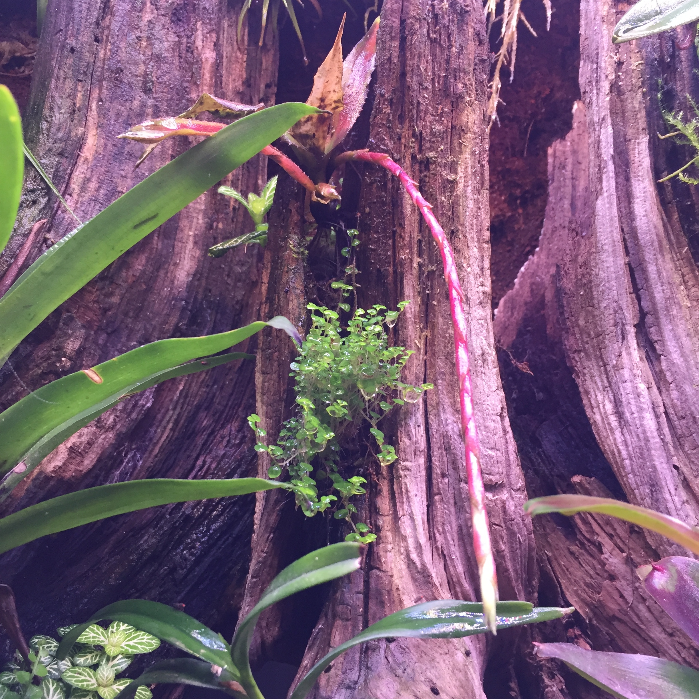 Tidigare i tråden undrade jag om bromeliorna kommer utveckla rötter nog för att jag ska kunna ta bort ståltråden som håller fast dem. 4 veckor efter jag satte dit bromeliorna har de flesta sänt ut ordentligt med rötter (några nästan 10cm!). Men jag låter ståltråden sitta kvar då jag inte har störts av den, och att den kommer troligtvis smälta in mer och mer med tiden.