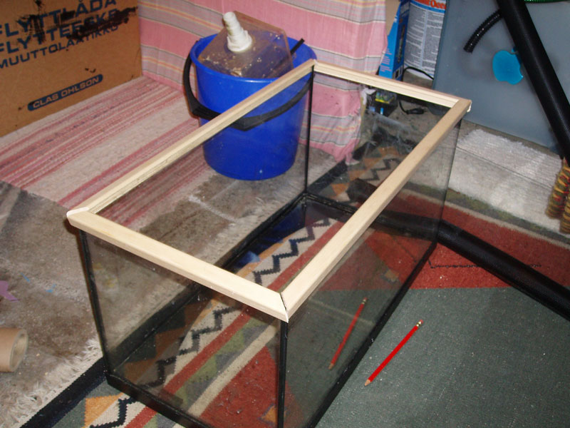 Lösningen på ventilation var att köra med luftpump kopplad till syresten i botten av vattnet och på det sättet få cirkulationen igång trotts att det inte finns luftintag i botten eller långt ner på väggarna.Du är medveten om att du helst ska ha något som gör så att det blir lite cirkulation i akvariet ev borra nått hål långt ner (nära bottensumstratet) Läst några artiklar om att grodorna är väldigt känsliga för koldioxid(?) förgiftning. Det (koldioxiden) är alltså tyndre än syre och lägger sig på botten av akvariet och grodorna kan börja få kramper m.m.