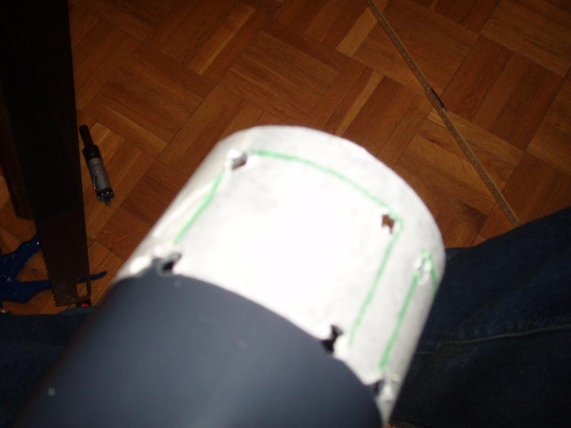 Sedan sågade jag ut och limmade fast plast/filter-nätet. Borrade upp ett hål för slangen där vattenflödet ska "blåsa" ut i toppen.