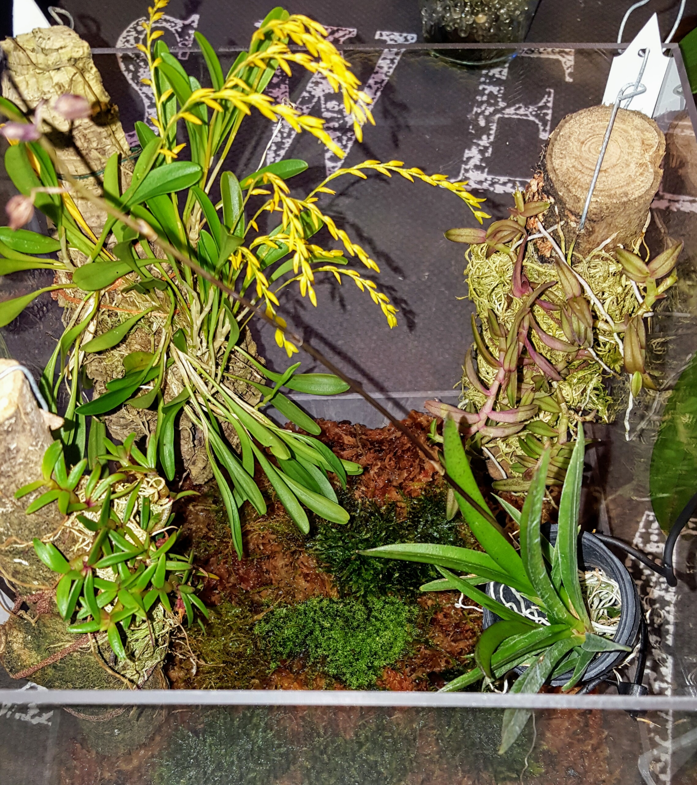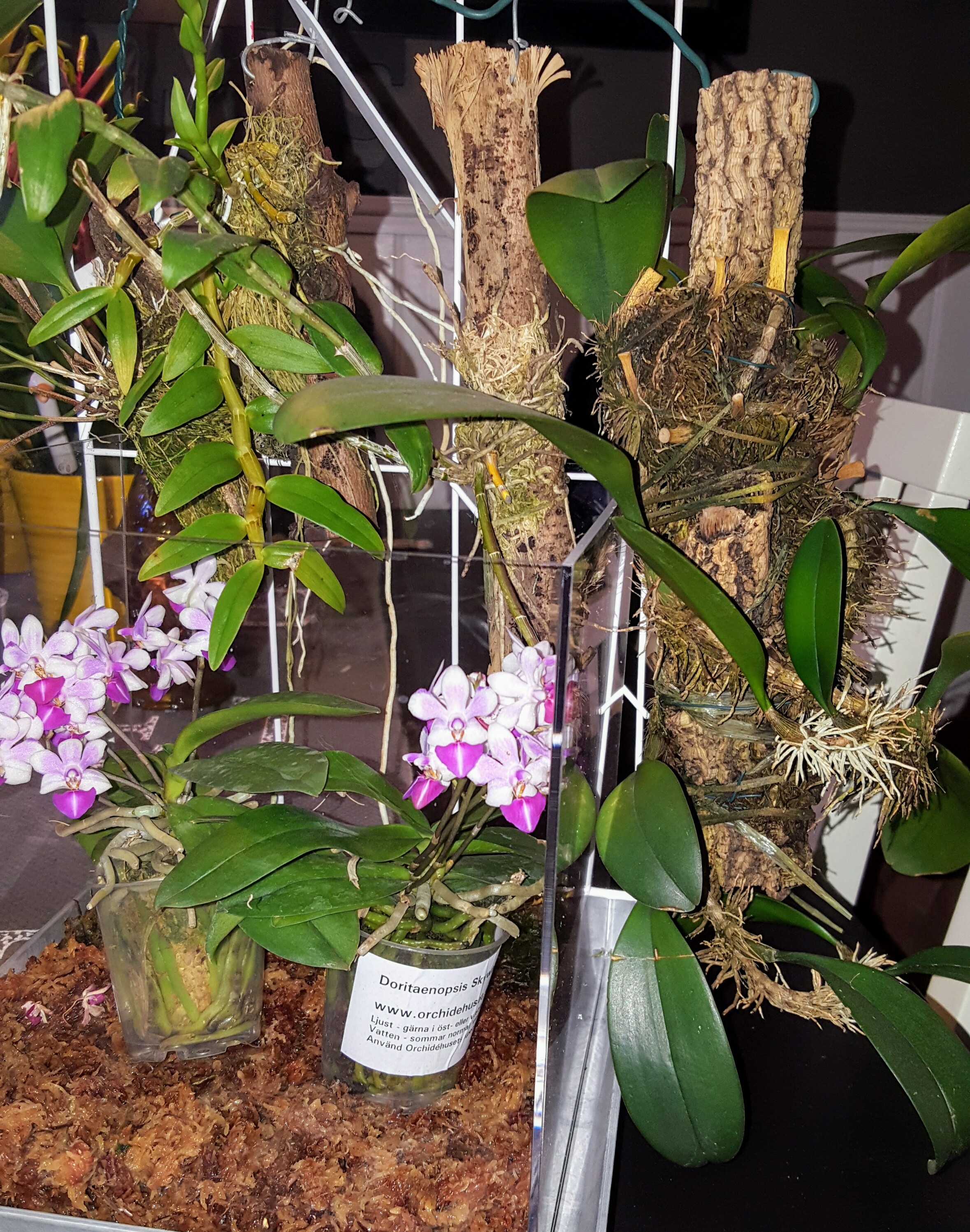 Till vänster upptill på 2anär det Dendrobium anosmum.Den högra upptill vet jag inte vad det är för art,men har tagit o planterat skott storburken