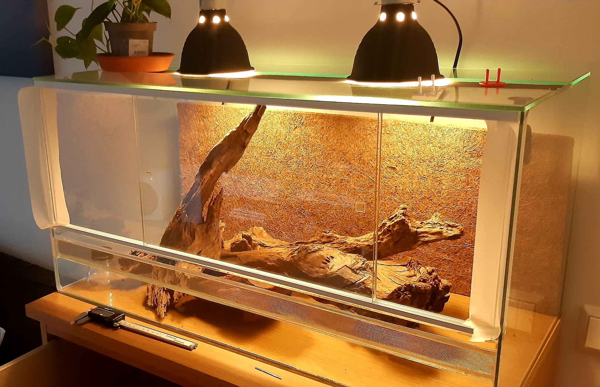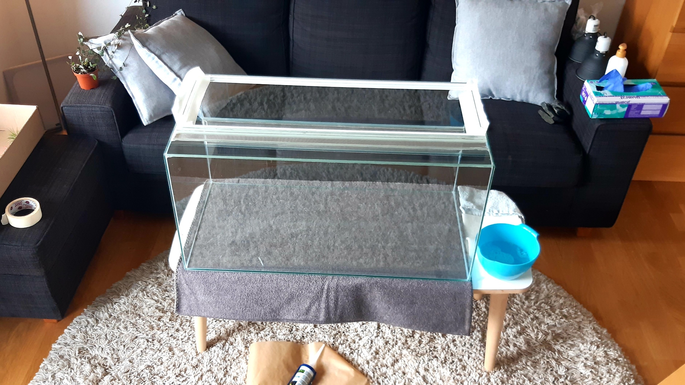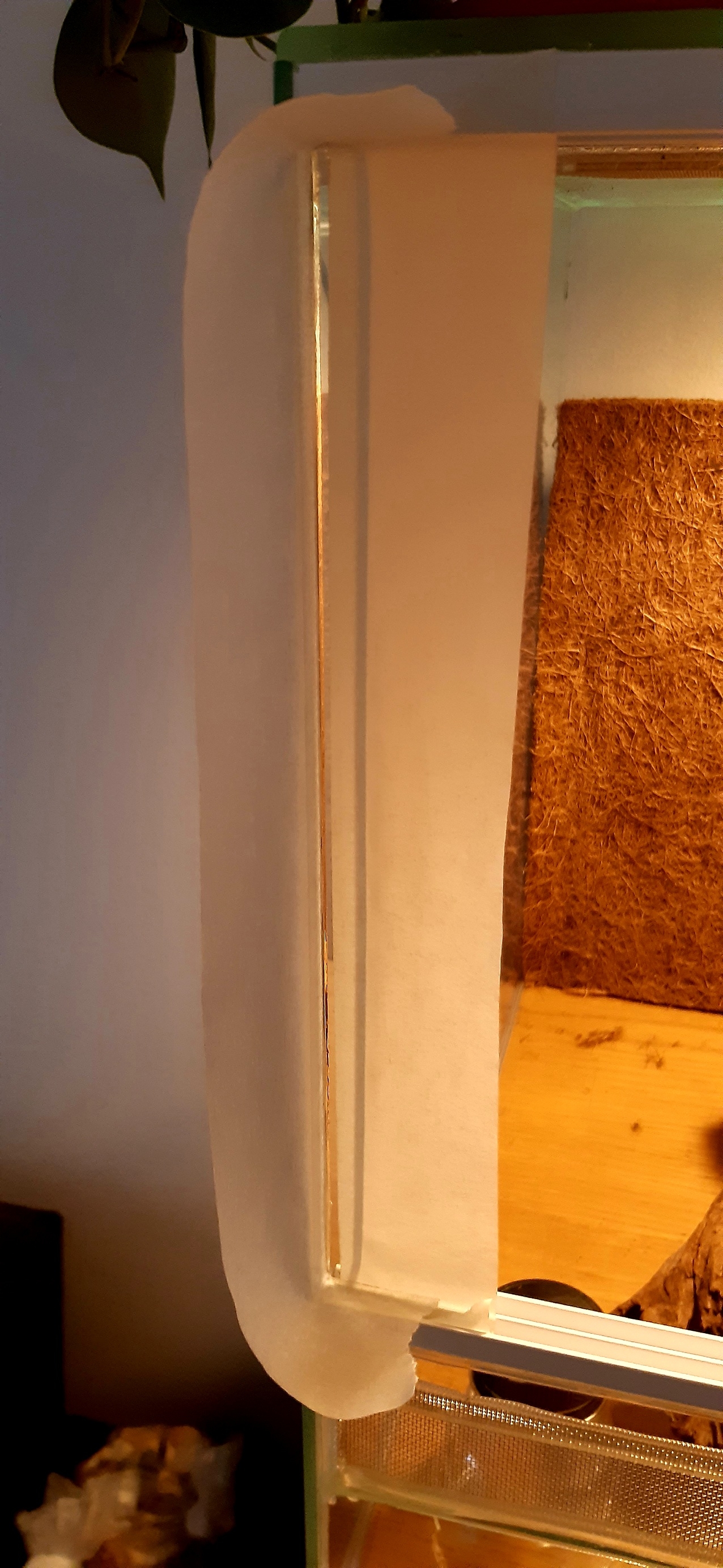 Idag blir det ett försök till att täta terrariet lite extra. Ska även dra en sträng på bakre glasdörren, inramad av två linjer med maskeringstejp så att strängen blir rak och fin. Dock får denna inte bli mer än 3mm hög.