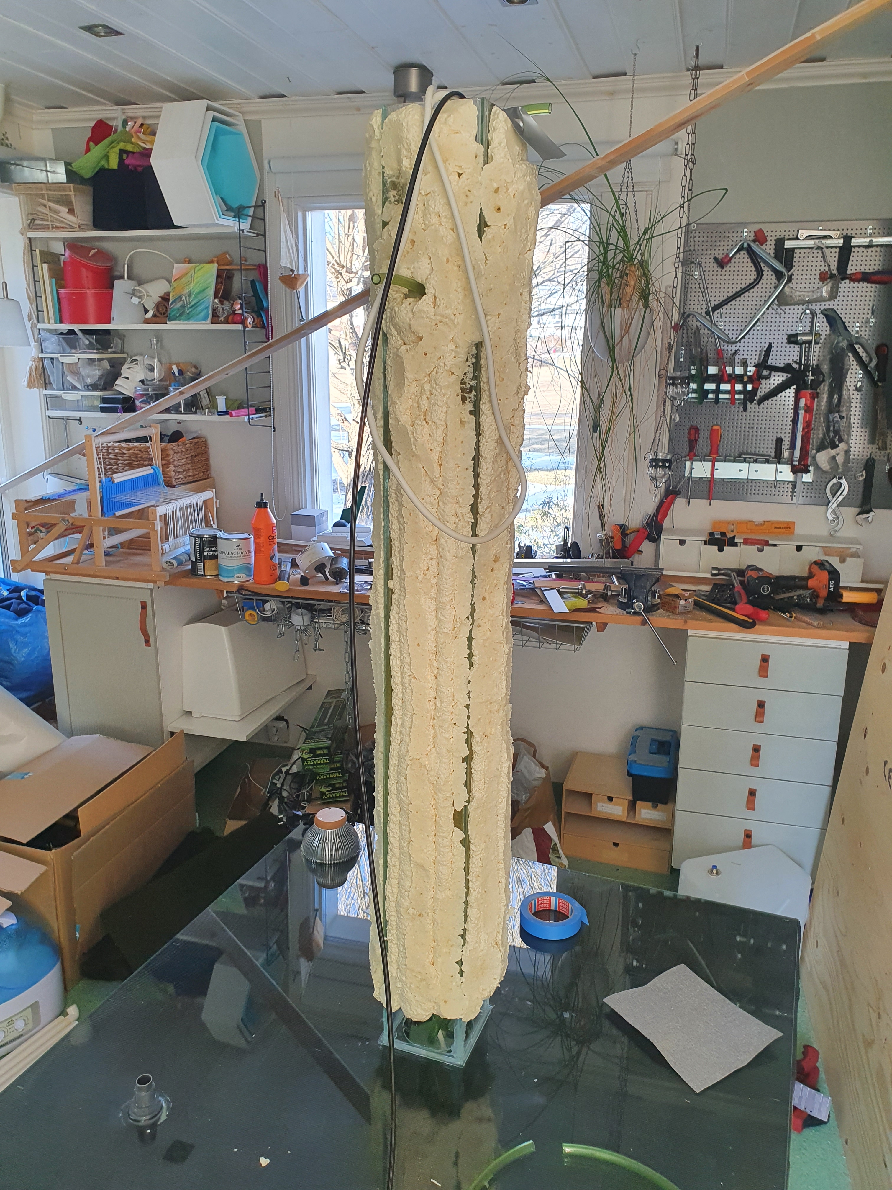 Lite andra saker har kommit i vägen (livet) så det har varit lite stiltje i projektet lite drygt en vecka men nu är i alla fall mittdelen på plats. Med risk för att outa det stökiga hobby-rummet som jag jobbar i kommer en bild på helheten så här långt. Jag inväntar att få tag på ännu mer trä som kan bli grenar som kan fogskummas på plats som blir nästa steg. Går att se att jag redan dragit slangen till dysorna, sladden till elförsörjningen och slangarna till mina potentiella water-features etc.
