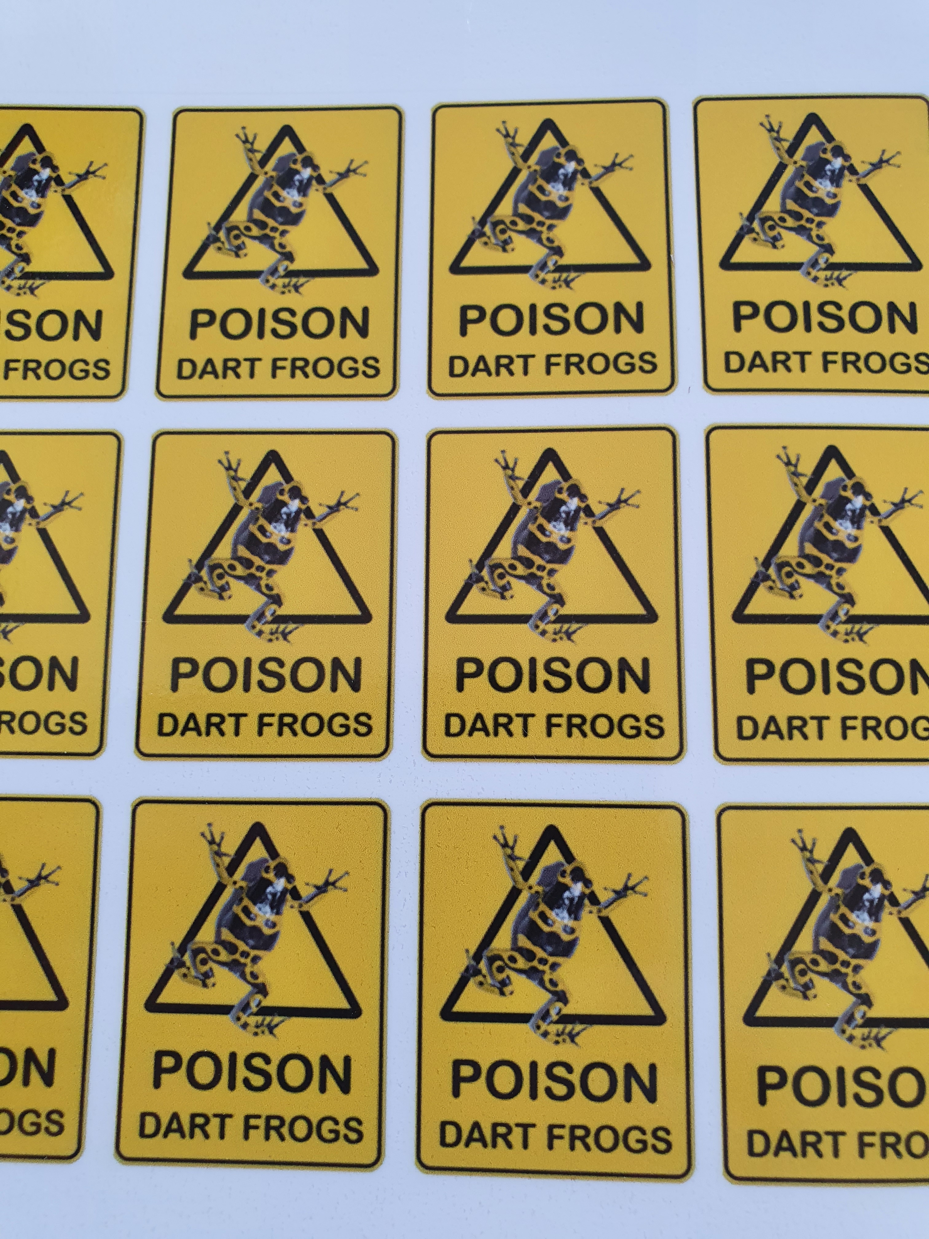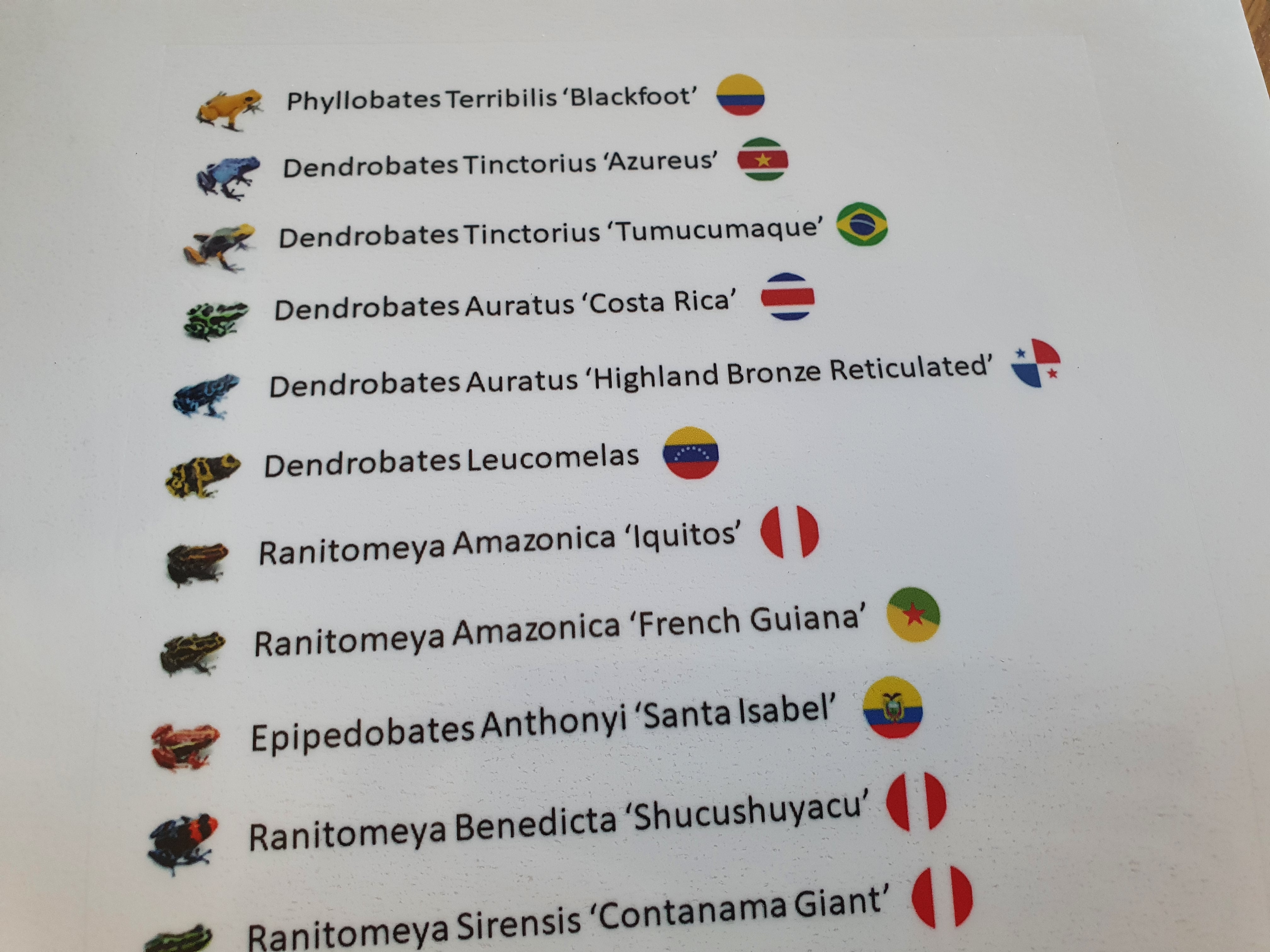 Jag har under tiden roat mig med att skapa klisterlappar som jag kan sätta på mina burkar. Innan någon påpekar att CB grodor inte är giftiga är det mest en conversation-piece för att berätta hur det verkligen ligger till, en kul grej helt enkelt. Den andra delen är avlånga klisterlappar som är mer informativa, dels genom att ha en miniatyr så att besökare vet vad de ska leta efter i burken men också lite vetenskapligt namn och varifrån i världen de kommer. Insåg när jag gjorde denna att ingen av mina nuvarande arter huvudsakligen kommer från samma land som någon annan även om det finns morpher som är etablerade tvärs gränser. Har inte varit ett mål utan bara en ren slump dock.