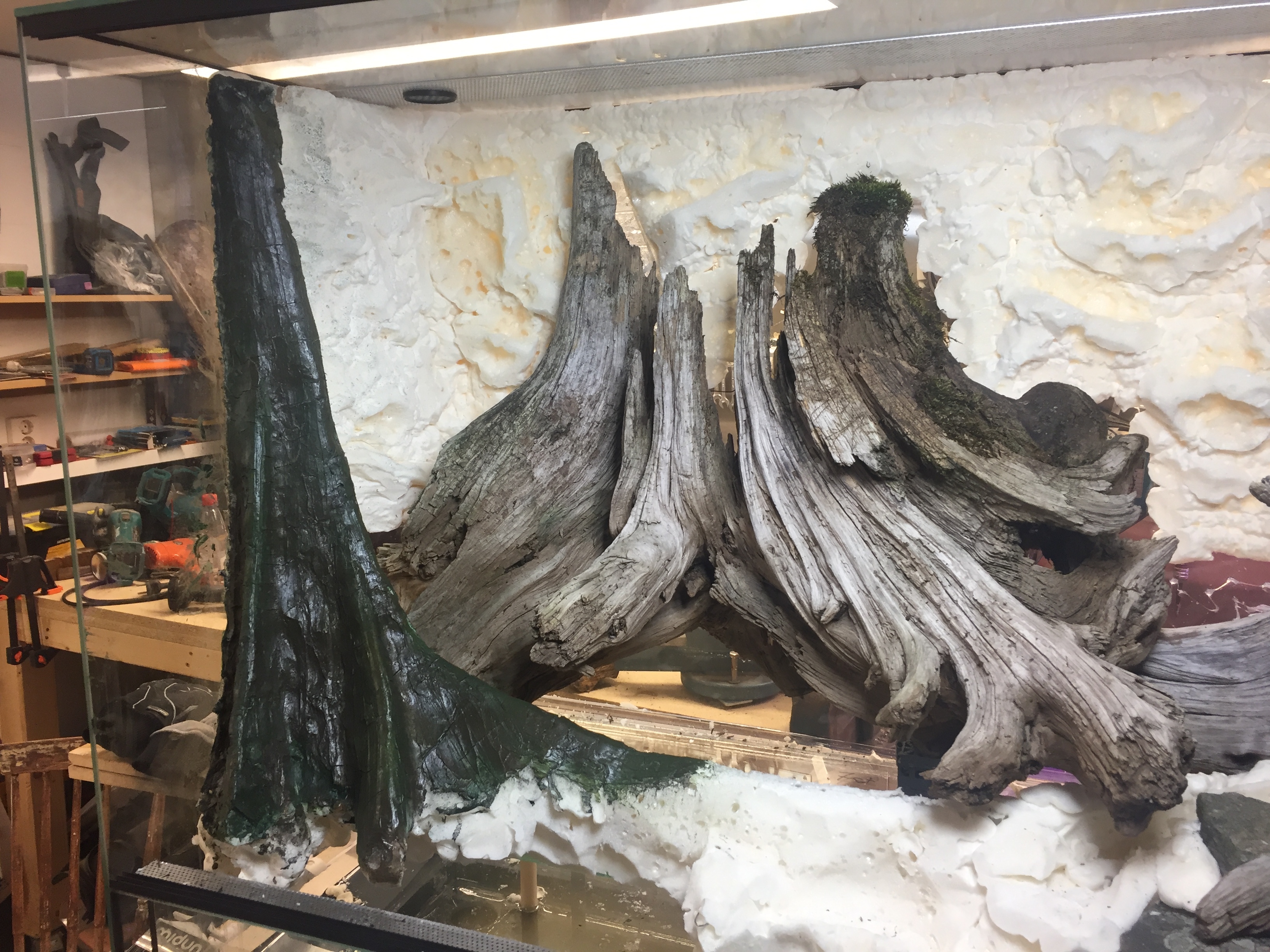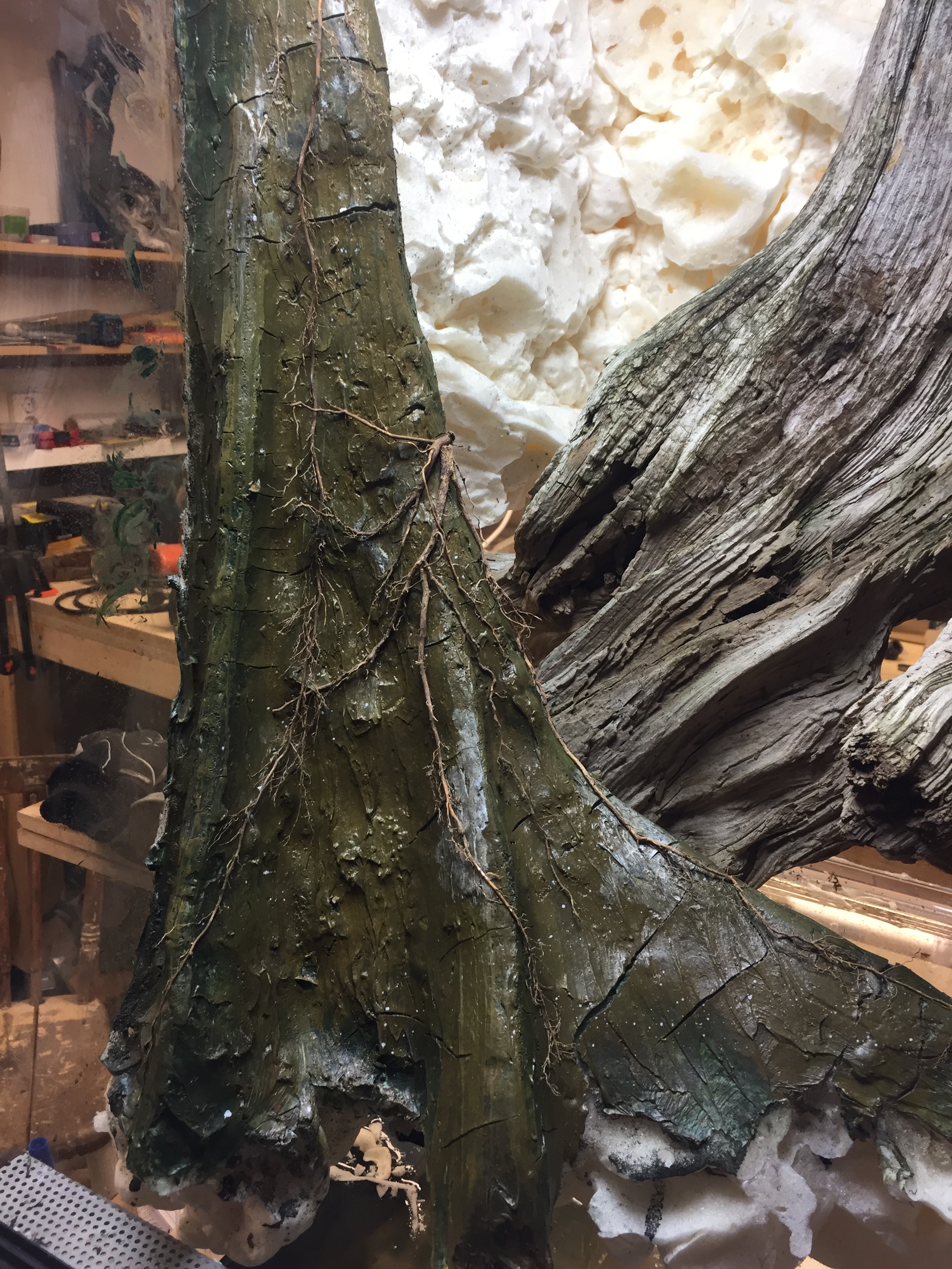 Har experimenterat lite med färgerna, blandat i mer brunt, och gjort den lite ljusare. Idag har jag även monterat några vanliga riktiga rötter för att efterlikna strypfikusen i regnskogen. Det gjorde susen tyckte jag! Det skapade skuggor och struktur och på så sätt ett steg närmare en mer naturtrogen buttress rot.