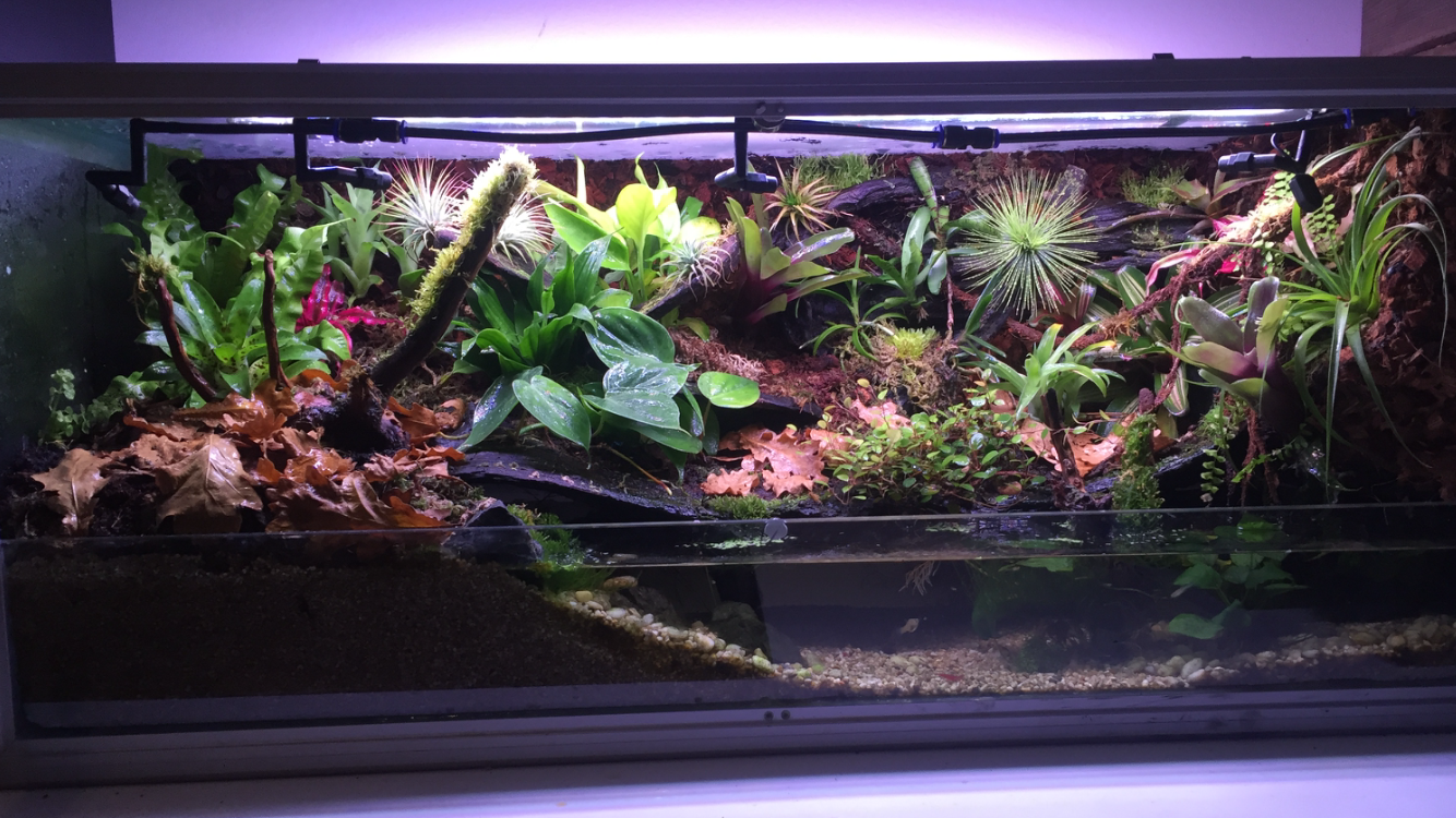 Haha! Tack Frank! Nu återstår bara att grodorna ska bli nöjda också. Börjar redan ångra mitt val att använda ett gammalt akvarium. Har förstått (för sent) att höjden på burken kan vara ganska viktig. Speciellt om man trånar efter ranitomeya amazonica ”rio tigre”. Burken är 45*95*45, men som ni ser har de nedersta 15 centimeterna okuperats av en vattendel. Det är väl bara ta och börja planera ett till terrarie som är högre? Eller vad tycker ni? Ahh, frugan kommer slå ihjäl mig!