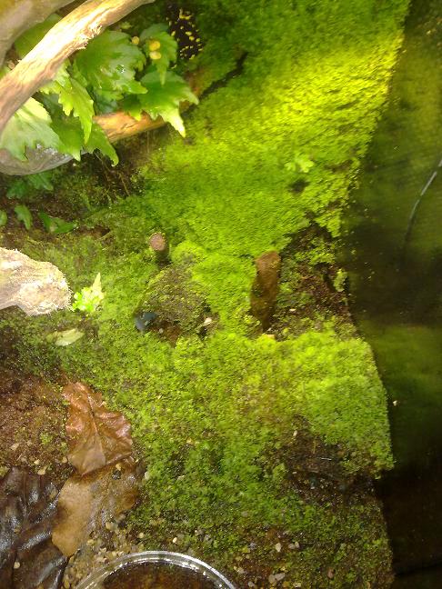 Efterhand som mossväxten ökar i terrariet ökar också fuktigheten så mossan växer till sig mer och mer, men det tar lite tid. Det blir oftast för fuktigt i de terrarier som jag har mossväxt överallt. Det är dessutom väldigt få arter som jag hittat i den miljön i naturen.