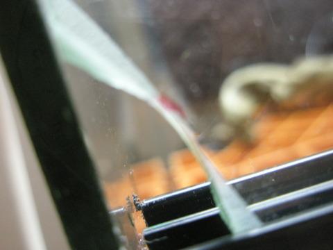 Under tiden fixade jag en brödback, skar till den, och efter ett tag, och många svordomar gick den in i terrariet.