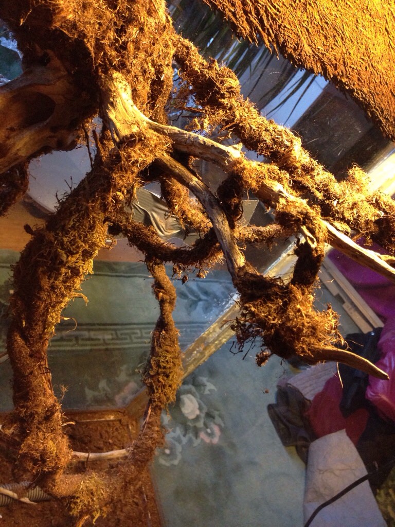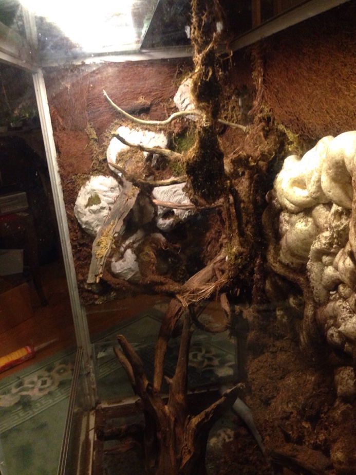 Har ingen tidigare bild på det men först la jag ut rötterna och grenarna som jag ville ha sen lite silicon för att dem ska sitta lite bättre sen fogskum följt med ett silicon täcke o på det torv.