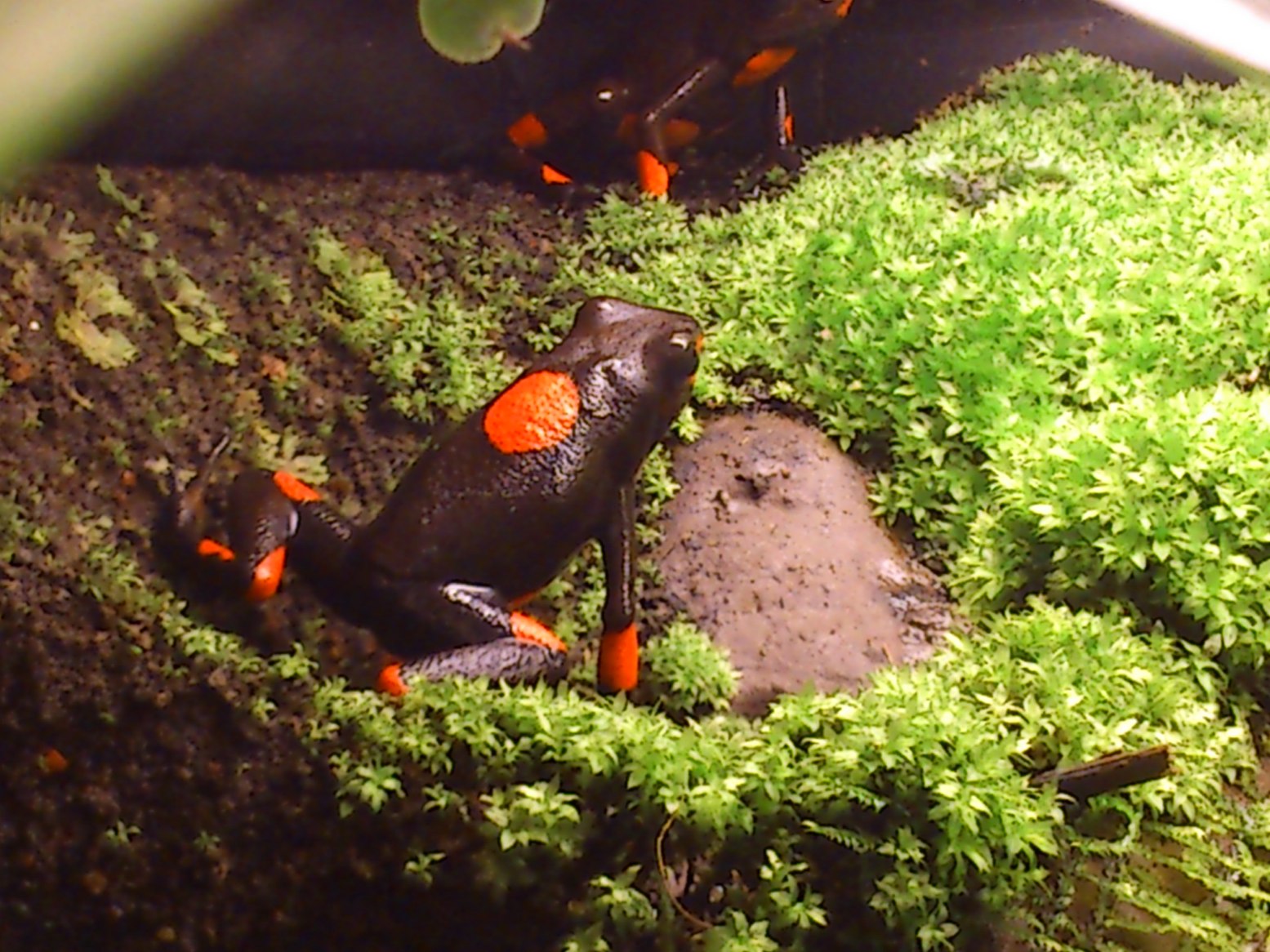 Dom svarta går i ett 60x60x45 exoterra och dom bruna i ett 90x60x45 exoterra. Temperaturen har hållit sig runt 25 grader eller strax under. Det som kan vara intressant är att jag inte har regnsystem i en enda av mina burkar. Tre sidor är täckta (sika mix) och så kör jag med "dripp wall" så att vatten rinner över väggarna med hjälp av en pump under 5-10 sek några gånger under dagen med några timmars mellanrum. Fuktigheten hålls hög men det är ändå ganska torrt. Botten består av sådant där blått filtermaterial och på det är det orchidebark och sedan löv. Vattnet i botten kommer inte i kontakt med barken men den är nog fuktig pga bevattningssystemet. Löven längst upp är däremot helt torra. Dom underliggande löven är fuktiga och förmultnar underifrån. Jag har nästan alla växter och rötter/grenar att utgå från väggarna så ganska långt är botten helt slät med torra löv. Det ligger en del filmburkar för äggläggning bland löven plus en del filburkar stående fyllda med vatten för yngel... men i övrigt är det ganska tomt. I något av terrarierna står det någon större bromelia på botten också. Speciellt till dom stora Oophaga som har större terrarium har jag byggt upp det så att det finns flera plan i terrariet. Jag gillar "liggande stock/gren modellen" och kar kört det i dom lite större burkarna. Grodorna kan röra sig ledigt på ganska "stora ytor" då och dom utnyttjar alla våningar.