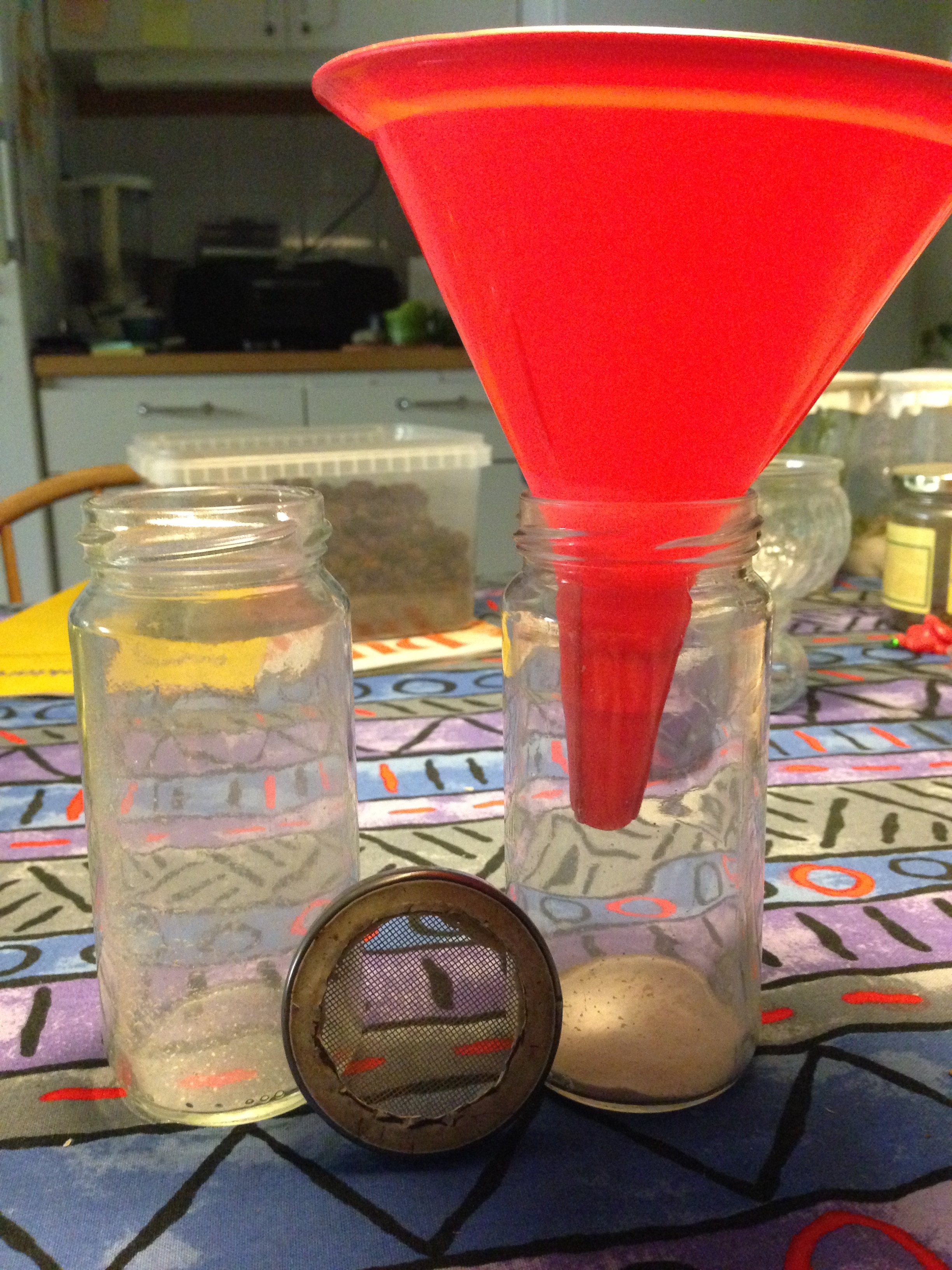 5. Sätt tratten på den tomma glasburken och skaka ner överflödigt vitaminpulver genom metallnätet i locket