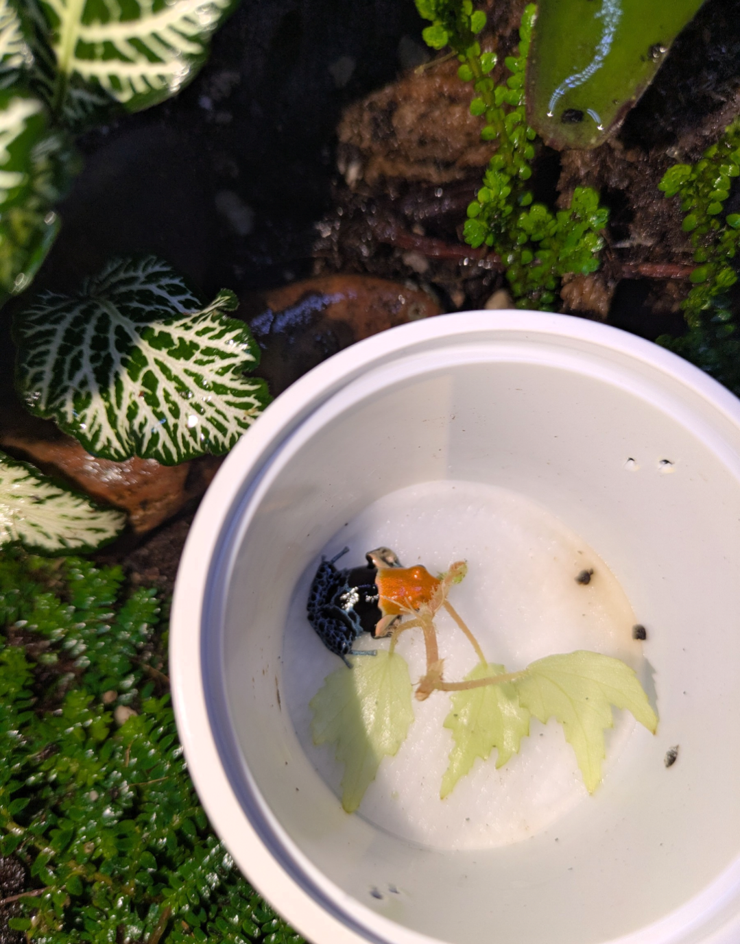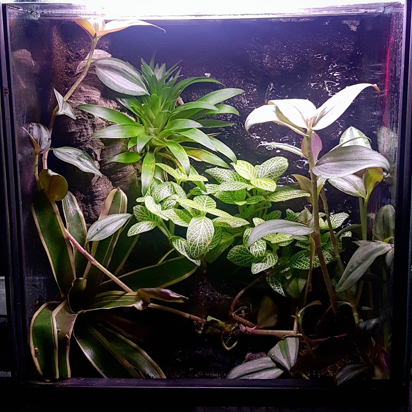 Jag sög på aquascaping, men kände att regnskogsterrarium var mer min grej. Laddar upp ett foto på ett terrarium med min lilla jungfrugecko.